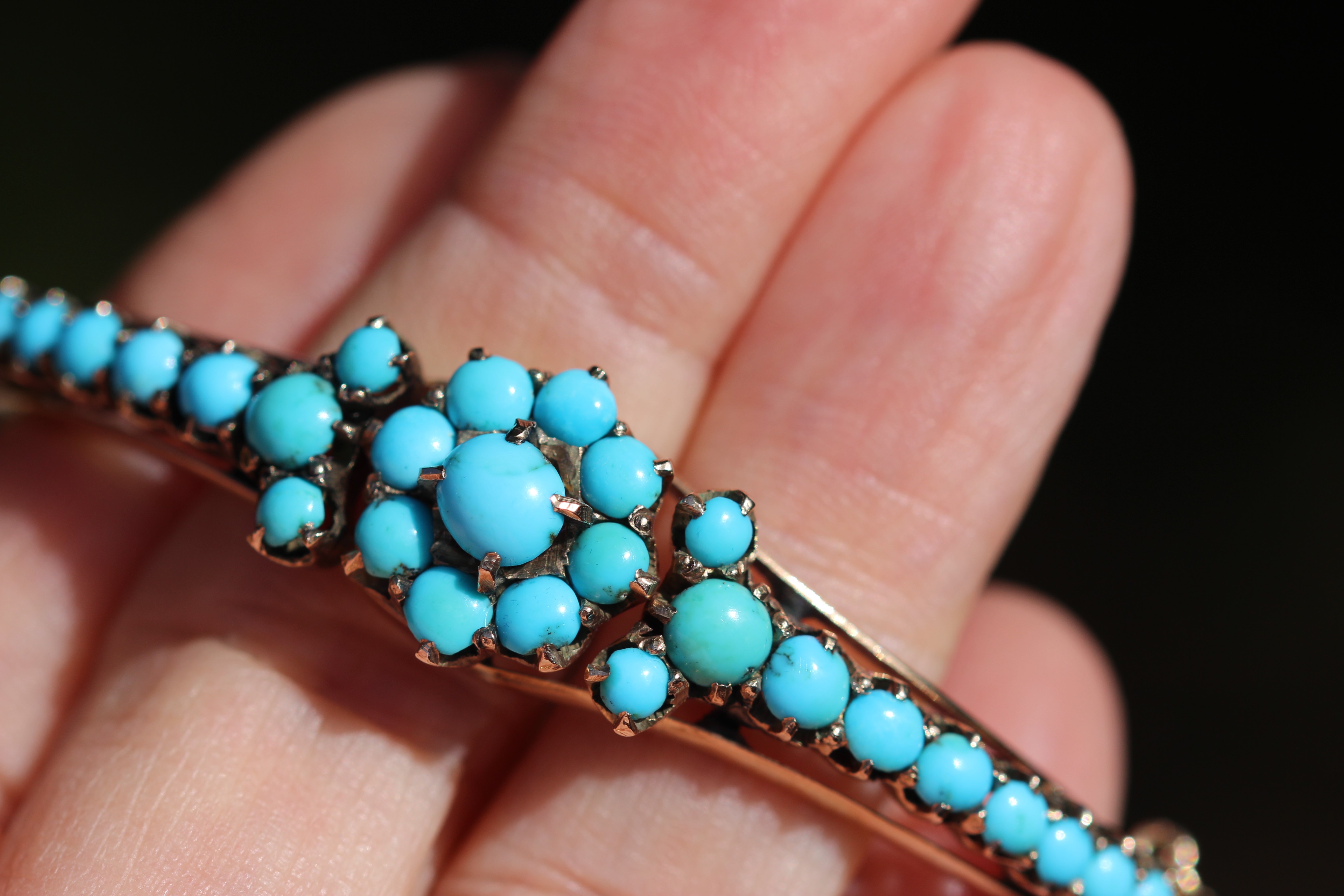 The last bangle is a stunner. The top half is set with turquoise, graduating in size, while the bottom half has two gold knife edge bands joined with five thin cross bars. There is a central cluster of turquoise, comprising a flower cluster with three turquoise on each side. There is a gold safety chain with a little turquoise and gold trefoil charm. The bangle has a hinge and a box clasp.
