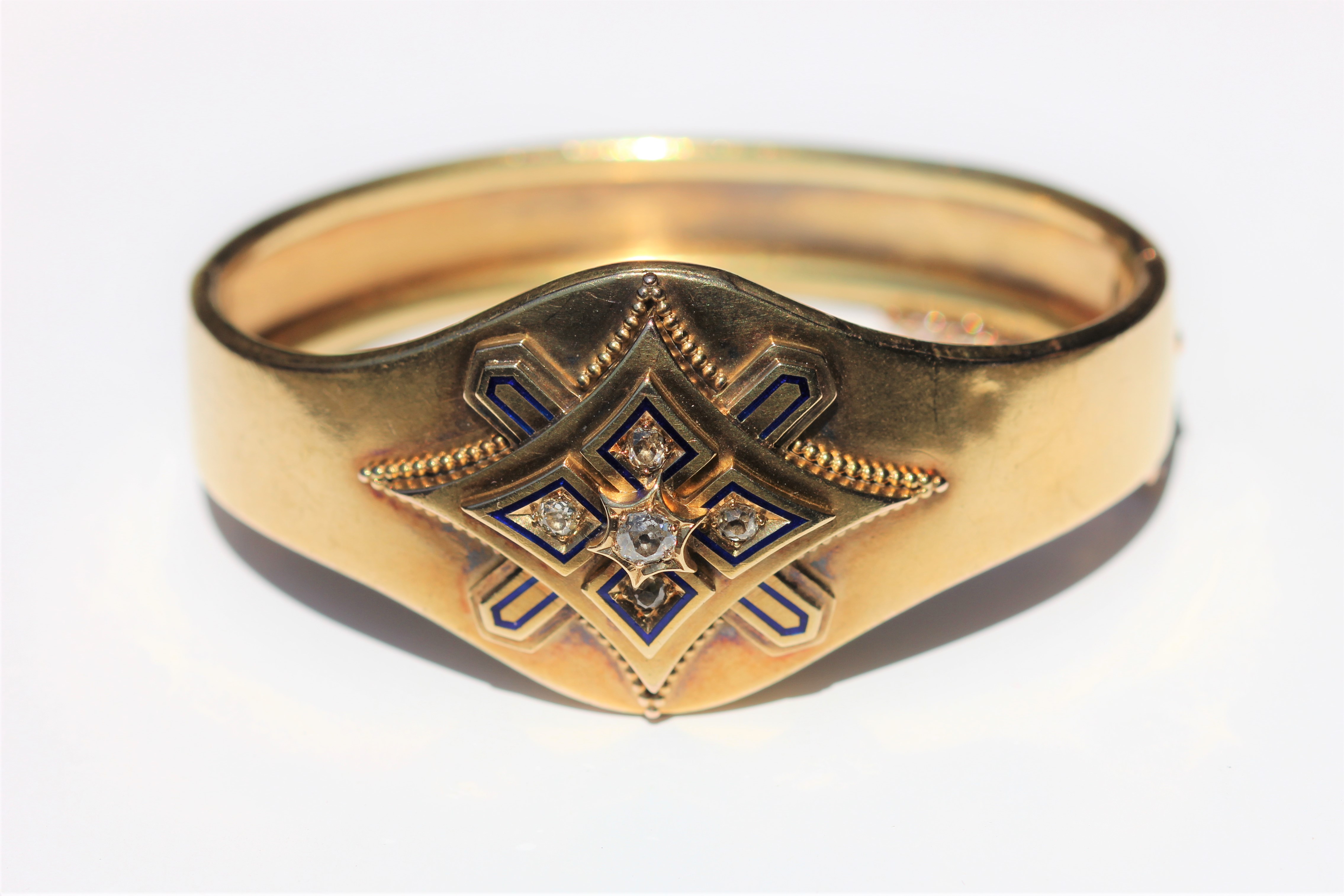 The next is a typical mid-Victorian hinged bangle from the 1860s-70s. In 18kt gold (tested), it has a central elongated star and cross decoration. Both the star and cross are lined with blue enamel. There are four diamonds set into the star, plus a central diamond. The star has a beaded border. The rest of the bangle is plain, with a tongue and box clasp, which closes firmly and has a safety chain. Not surprising, given its age, it has a few tiny dents and scratches to the band.