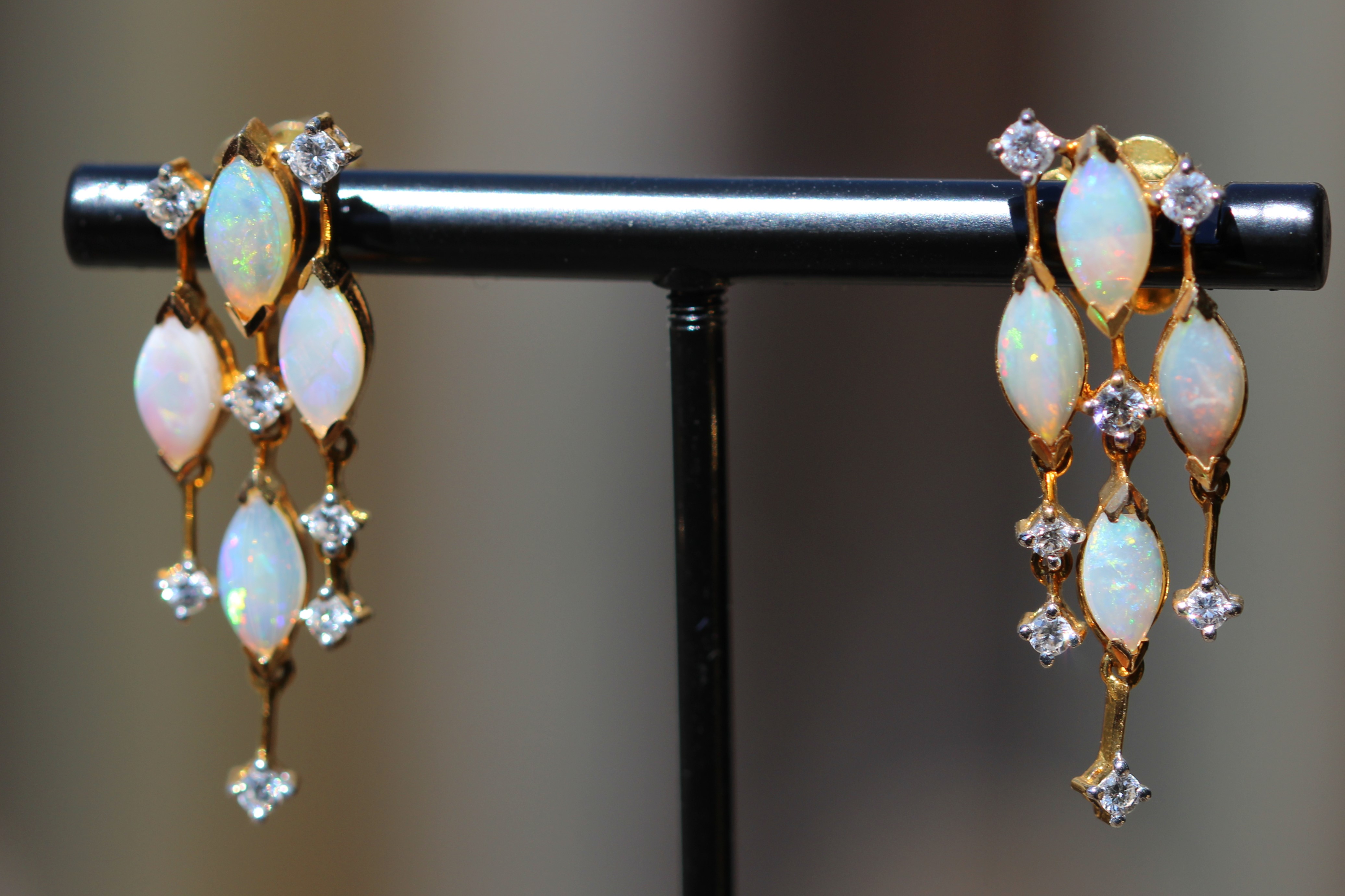 Precious opal displays a play of colour against a white, translucent or dark background. It is the background that describes and defines the type of opal. Black opal has a black, brown or dark gray background, white opal has a white or cream background and crystal opal is translucent. The play of colour is a display of iridescent colours – blue, green, yellow and/or red – which change depending on the direction you hold the gemstone.