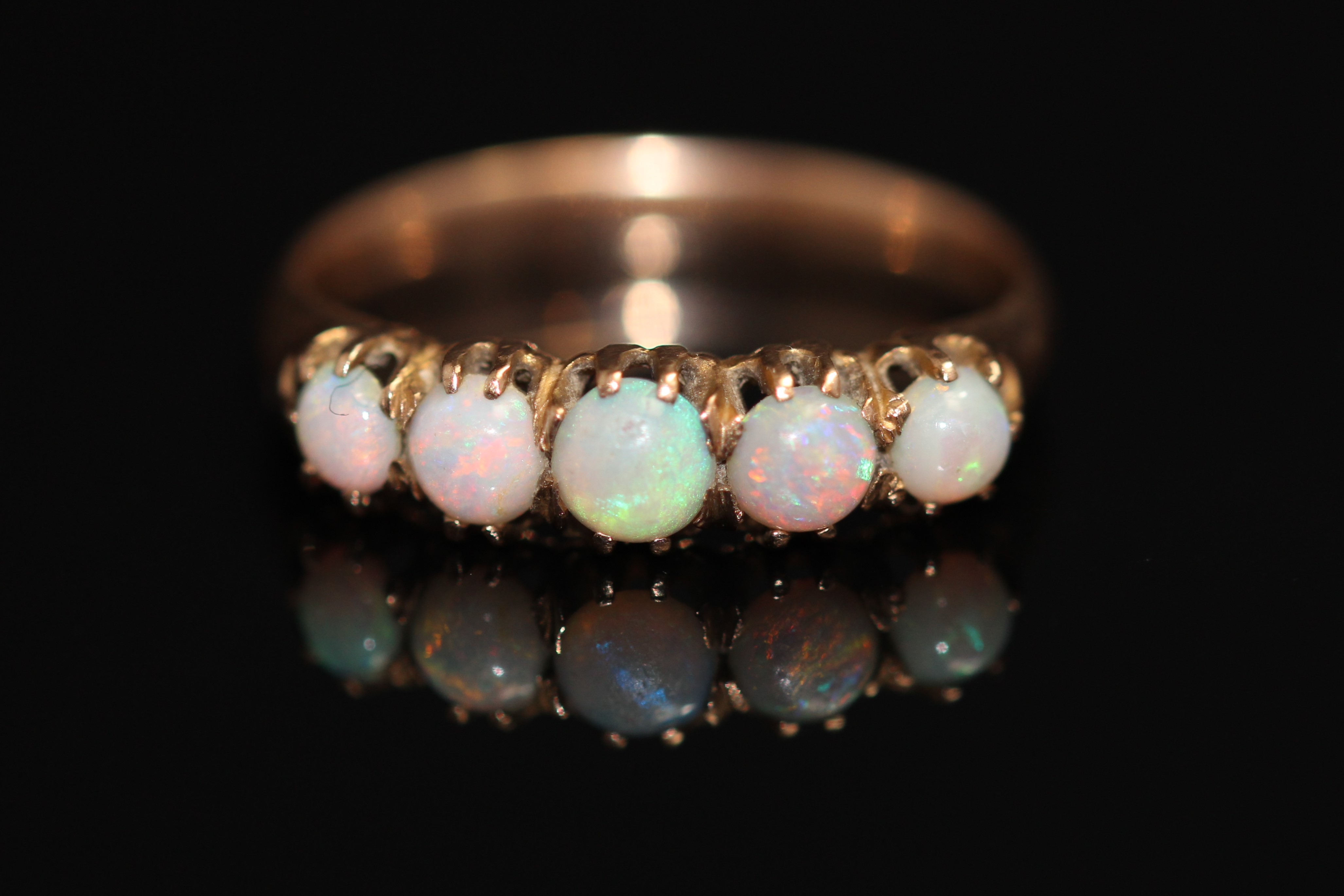Opals are the second gemstone for October. Precious opal displays a play of colour against a white, translucent or dark background. It is the background that describes and defines the type of opal. Black opals has a black, brown or dark gray background, white opal has a white or cream background and crystal opal is translucent. The play of colour is a display of iridescent colours – blue, green, yellow and/or red – which change depending on the direction you hold the gemstone.