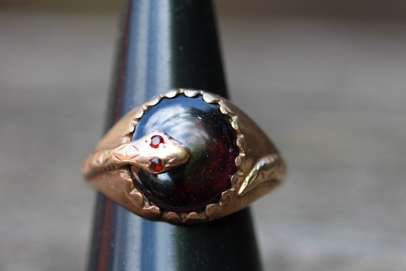 The ring pictured at the top of the post is quite different. A garnet cabochon is set in a collet with a small snake forming the band and resting its head on the top of the garnet. It has garnet eyes as well.