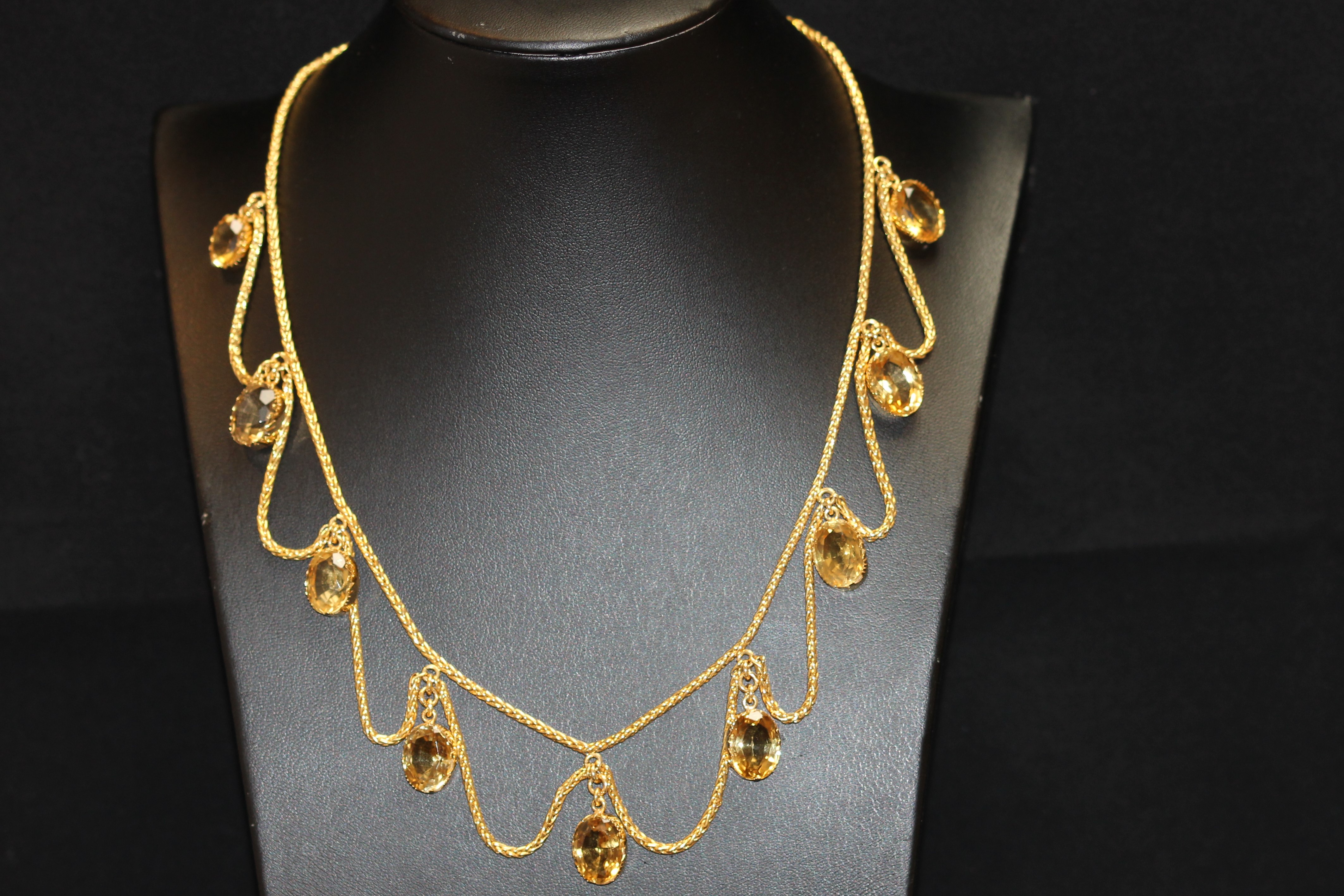 Antique natural citrines are more likely to be a lemon yellow. In the 19th century, when the necklace below was made, the citrines were left open at the back. The ones in this necklace have a good strong colour and sit well with the gold swag chains.