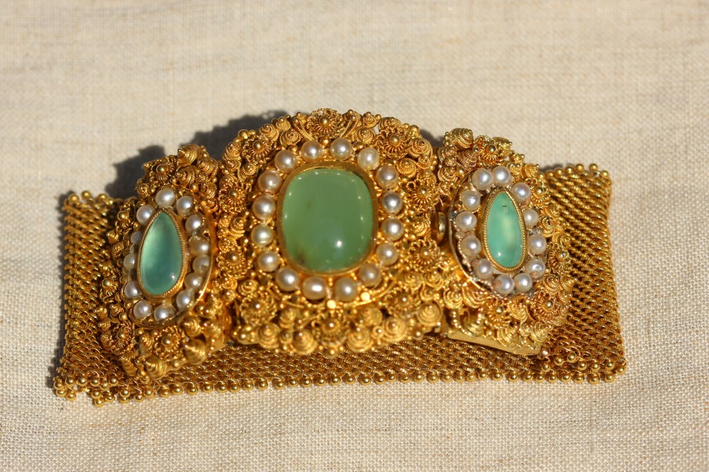Some cannetille work was created out of wirework and rosettes being soldered together, while other pieces like bracelets and pendants required a thin plate of gold onto which the wirework was soldered. By building up pieces of jewellery with coils and rosettes, they could make pieces look much thicker and ornate, while keeping the structure of the piece as light as possible, with less use of gold. It was very time consuming and required considerable skill. Cannetille work was widespread from 1815 to 1840, first in England and then in France as the latter recovered from the wars. This decoration was often further embellished with bead work granulation, an Etruscan technique.