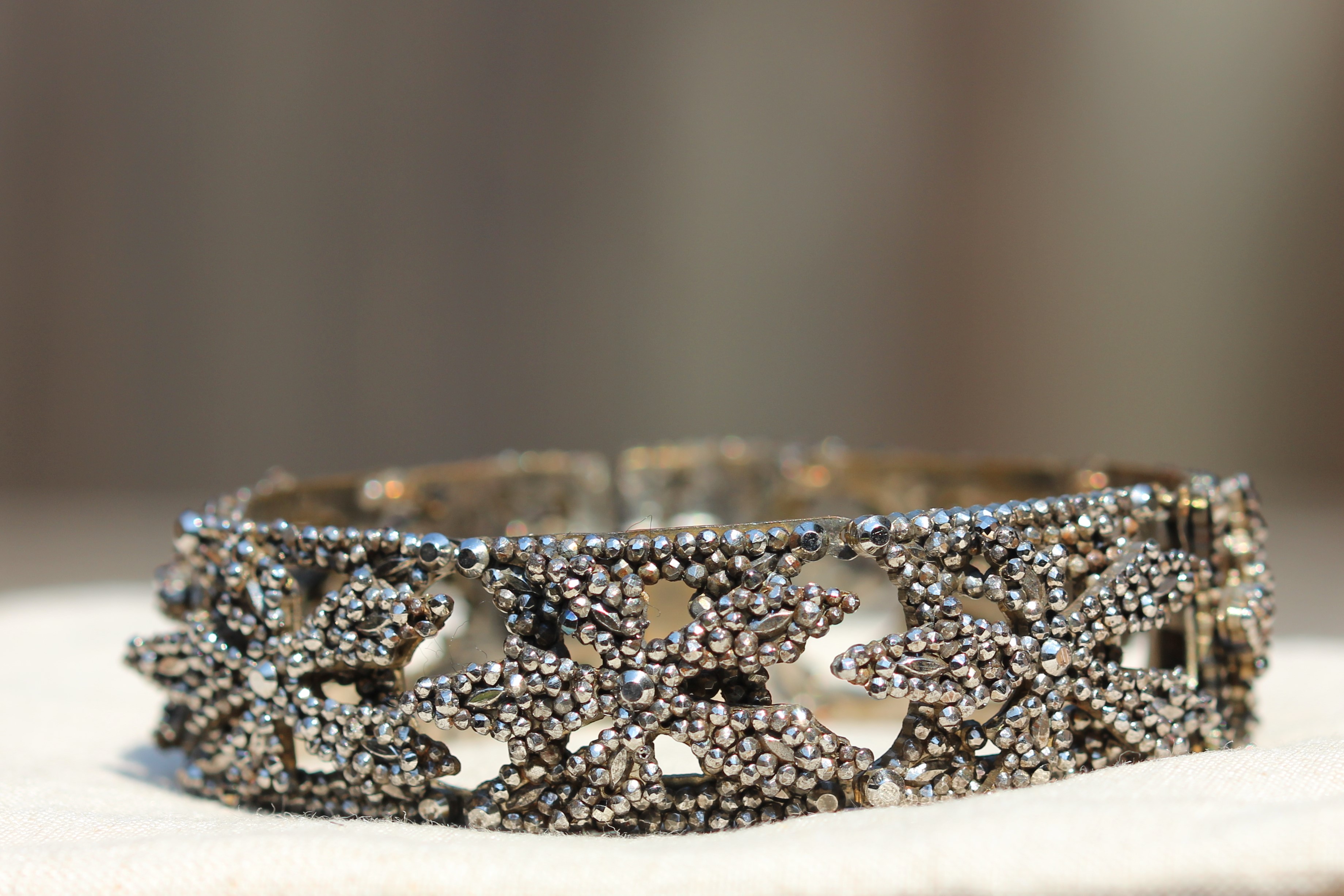 Even Napoleon’s financial situation was affected to a certain extent by his wars. He had given his first wife, Josephine, expensive gem-set jewellery during their marriage. When he married Marie-Louise of Austria in 1819, although he gave her some beautiful pieces of jewellery, he also bought her a cut-steel parure. The steel used was soft and was facetted and then polished to achieve a high metallic gleam. It was riveted onto a perforated steel or brass plate, usually in a pave setting. The French production of cut steel jewellery was given a boost by the gift.