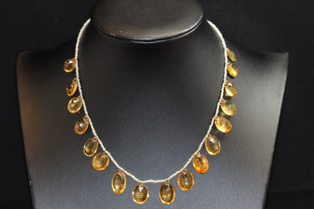 There are other autumn coloured gems though besides chalcedony quartz, such as the citrine. Citrine is a macrocrystalline quartz, usually transparent, and comes in lovely shades of yellow, with some bordering on orange. The necklace above is a classic example of late Georgian jewellery, with facetted citrines interspersed with small creamy seed pearls.