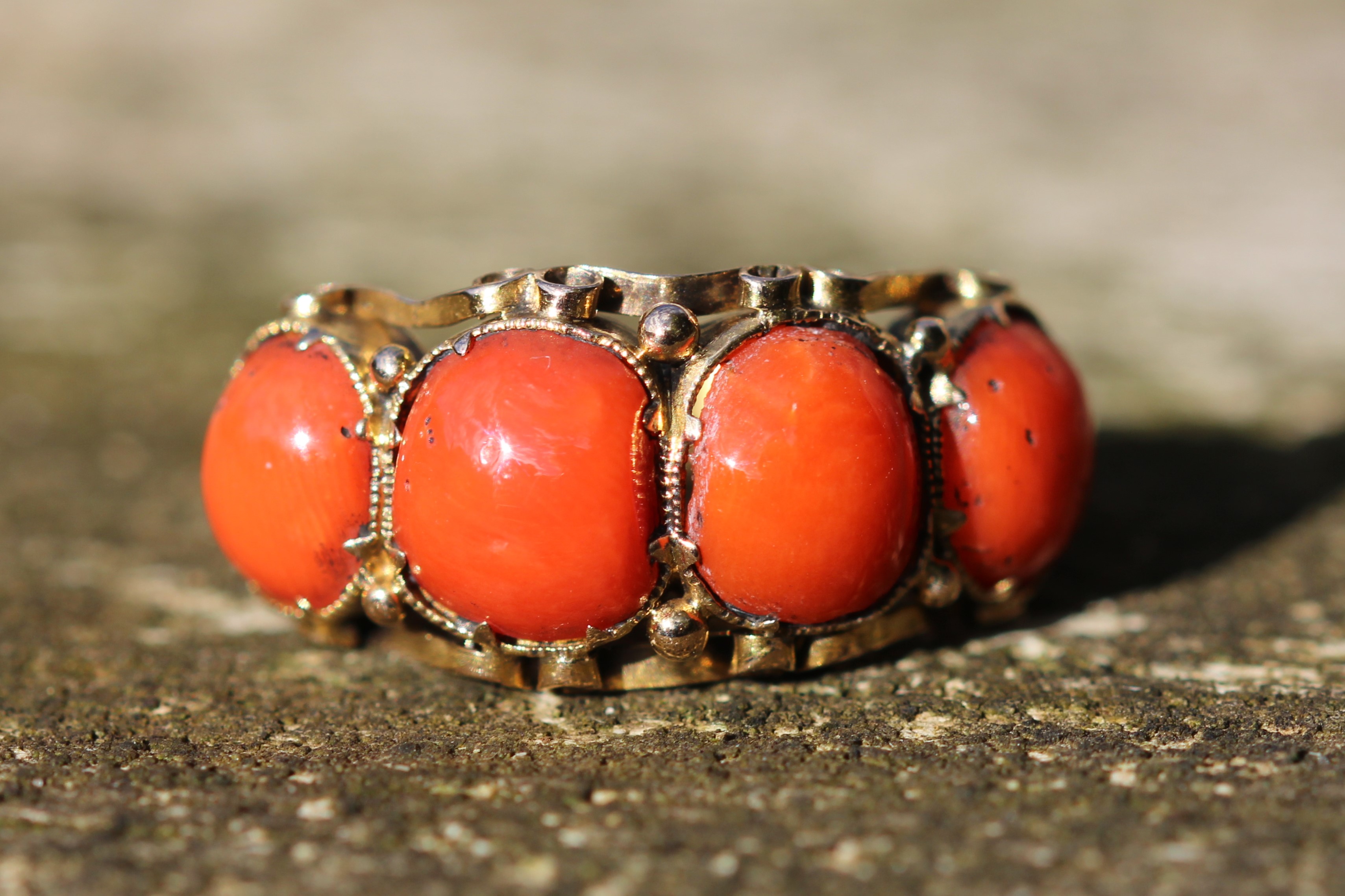 Coral, for instance comes in lovely shades ranging through creams, to pale pink, to salmon orange and dark orange and red. The coral in the ring below would probably have come from the town of Torre del Greco near Naples. In 1876, a School for the Manufacture of Coral and Cameos was founded by Umberto I to train coral carvers and engravers was established in Torre del Greco and it became a popular spot for Grand Tour participants to visit to buy souvenirs.