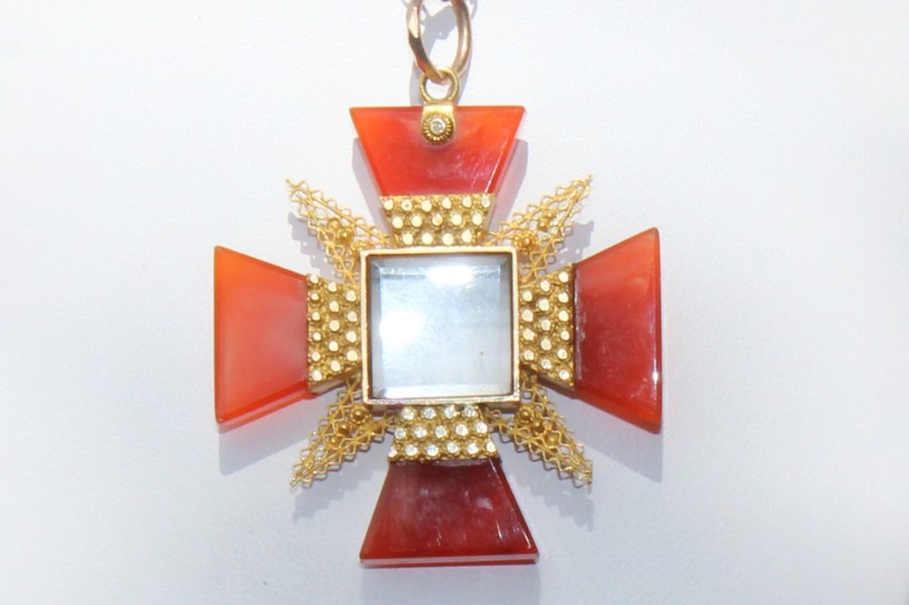 Heavy rain is still falling in parts of eastern Australia but hopefully will start to ease soon. I noticed that in Melbourne, which has had a few cold days, more leaves have turned autumn colours. In my last post, I featured jewellery made with carnelian and agate but I just wanted to include one more carnelian piece. The maltese cross at the top of the post is made of beautiful orange carnelian pieces. It is Georgian, with a glass central panel set around with ornate gold cannetille and wire work. The central panel was intended to house hair and would probably have had a gemstone set front. It is a striking piece.