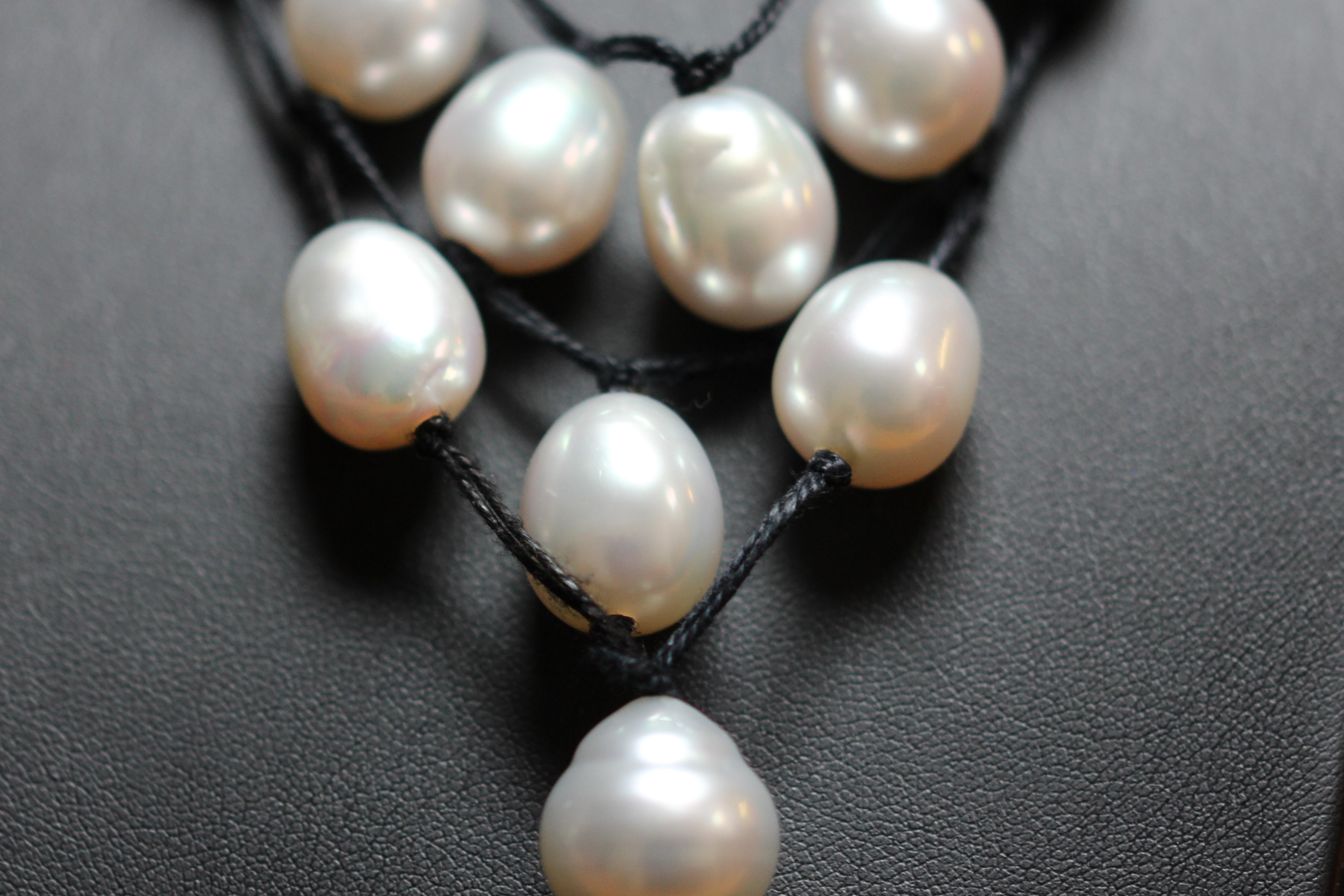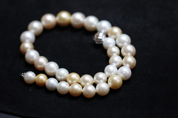 The size of a pearl is one of the GIA’s 7 factors of pearl quality. So how is the size of a pearl measured? With round and near-round pearls (spherical pearls), it is quite easy. You need to measure the diameter of the pearl, usually to the nearest 0.5th millimetre. So a pearl might be 5mm or 10mm in diameter. The seed pearls in the necklace on the left in the photo at the top of the post are tiny and measure 1.6mm. The South Sea pearls in the graduated necklace below range from 12mm to 15mm in size. This is a normal size range for this type of saltwater pearl.