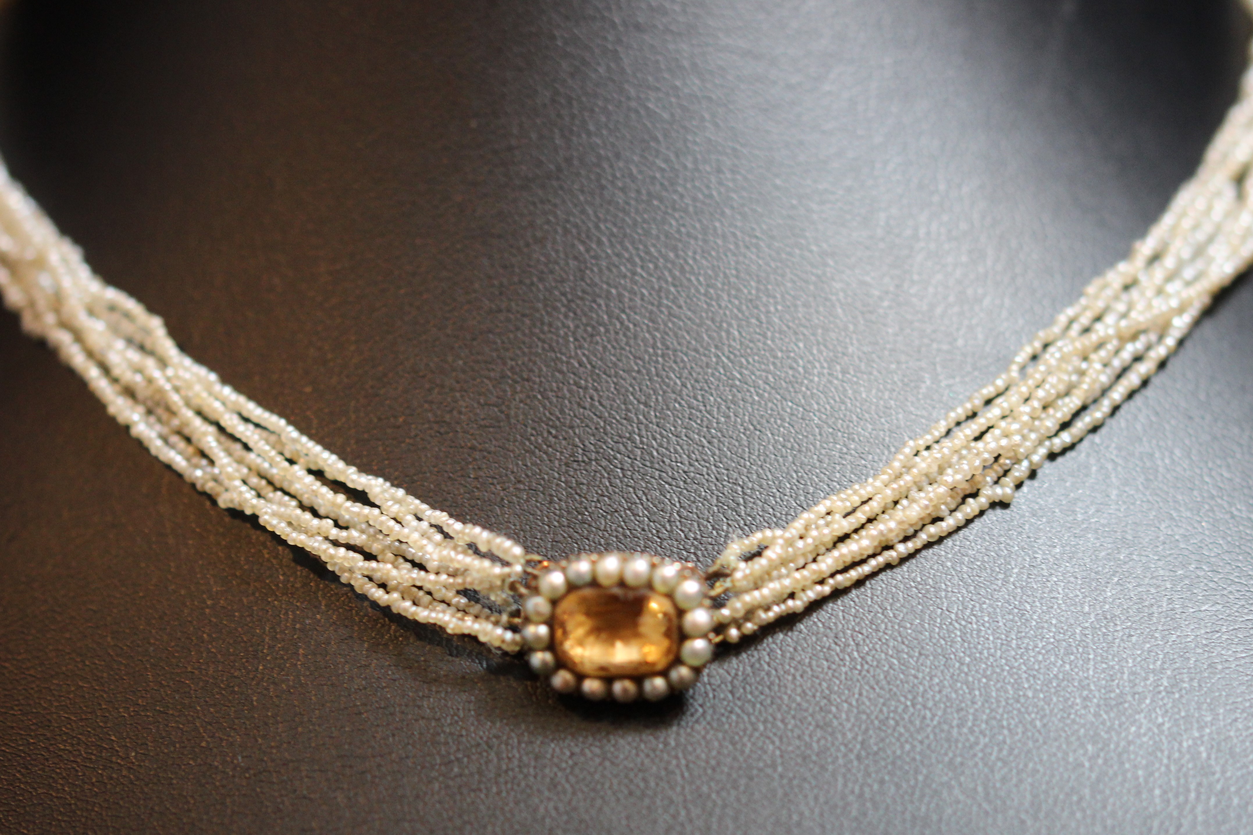 Delicate seed pearl necklace with yellow paste clasp with pearl border