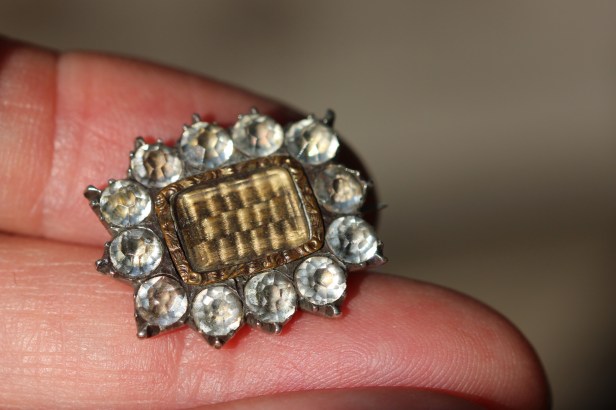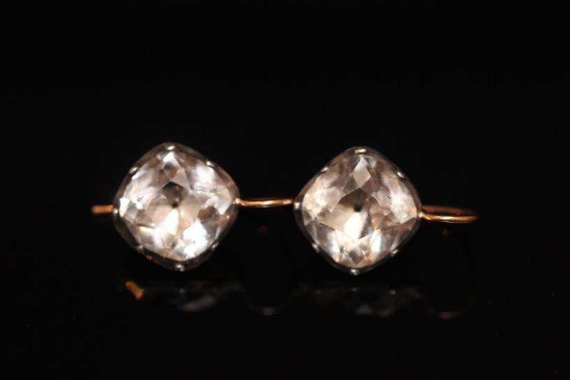 The eighteenth century was probably the height of quality for paste jewellery. While diamonds were cut in conventional shapes – rounds, ovals, oblongs, – and so were not set closely together. Paste, on the other hand, could be cut into any shapes which enabled them to be set closely together, resulting in a blaze of fire. Many 18th century paste stones had a tiny spot of black paint on the culet. It was said to be used to simulate the dark spot seen on the culet on a brilliant cut diamond. The paste earrings at the top of the post have a black spot.