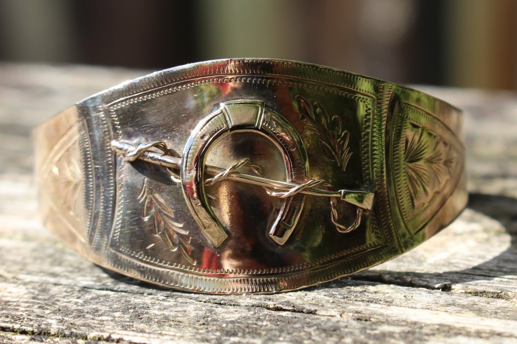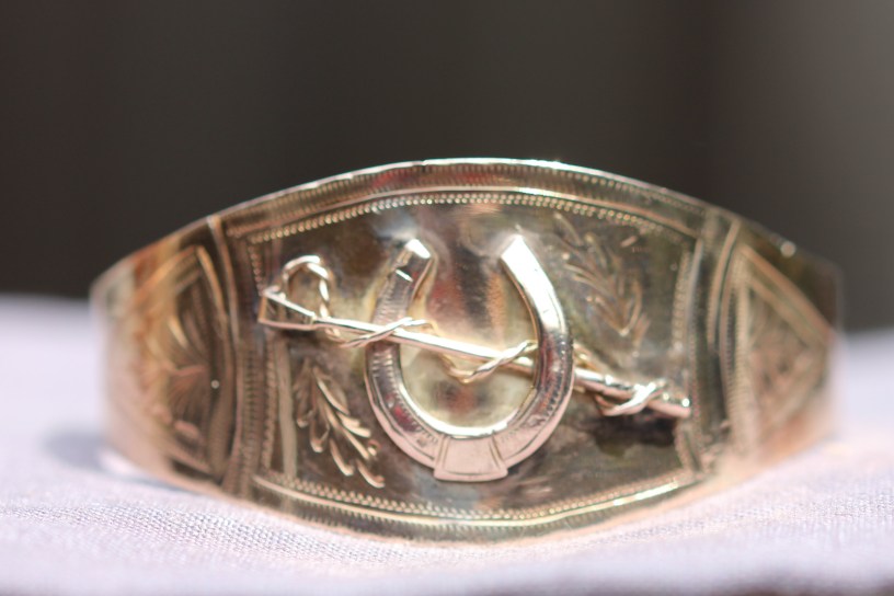 Symbols representing racing and equestrian have been used in jewellery for centuries. The bangle pictured at the top of this post and below is a good example. It is gold, and the front panel contains a horseshoe crossed by a whip. There are some leaves around the centre display and some more on each side panel. This style of bangle, which is adjustable to three sizes, was produced throughout the Victorian period and into the 20th century.