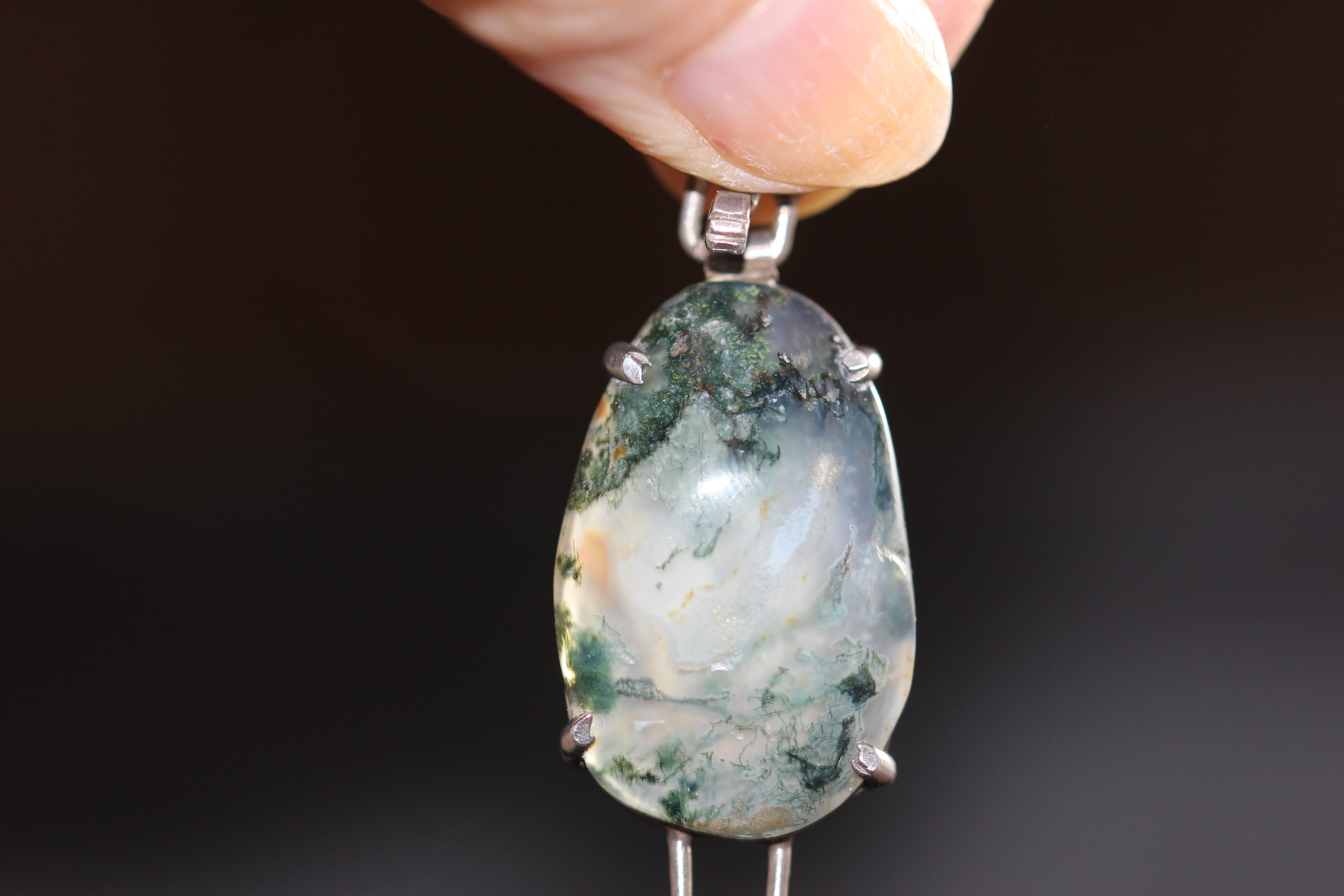 There are a number of different types of similar agates to moss agate. One is dentritic agate (also called mocha stone as it was first found in Mocha, Saudi Arabia) which also has a colourless to translucent background and inclusions in brown or black. The Maltese cross pendant below is a good example.