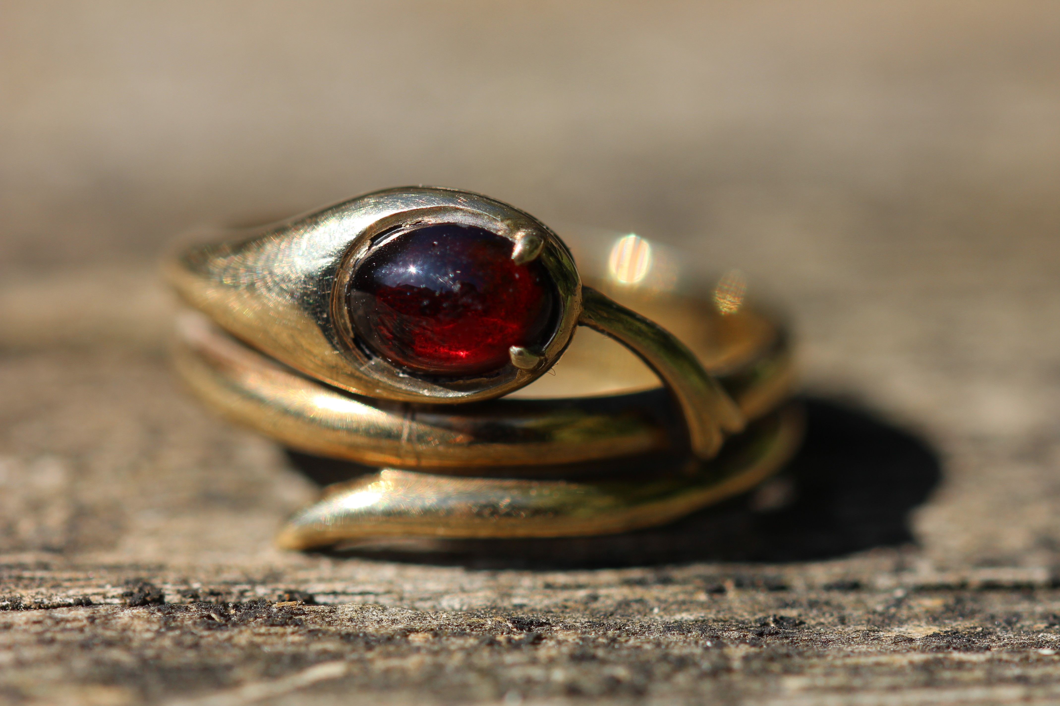 The final ring was made in 1989 and, again, is a simpler style when compared to the two headed snake rings above. The back of the garnet cabochon is open and the coils of the snake are just touching. It has a more relaxed feel.