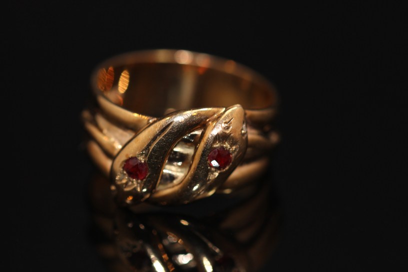 I have written before about my love of snake jewellery. I find that the way a ring, bracelet or necklace shaped like a snake coils around a finger, neck or wrist is quite beautiful. I have acquired some more snake rings in 2022 so thought I would show them off and also examine whether or not the design of the snake ring has changed over the last 100 or so years.