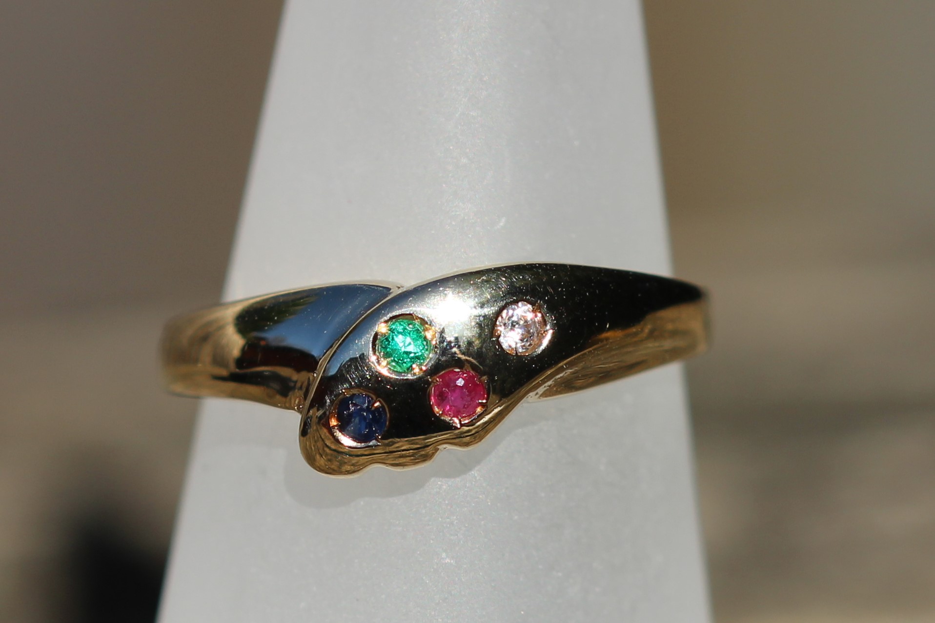 The snake ring below, set with a diamond, emerald, ruby and sapphire, has quite a modern look. It is streamlined and smooth but still clearly represents a snake.
