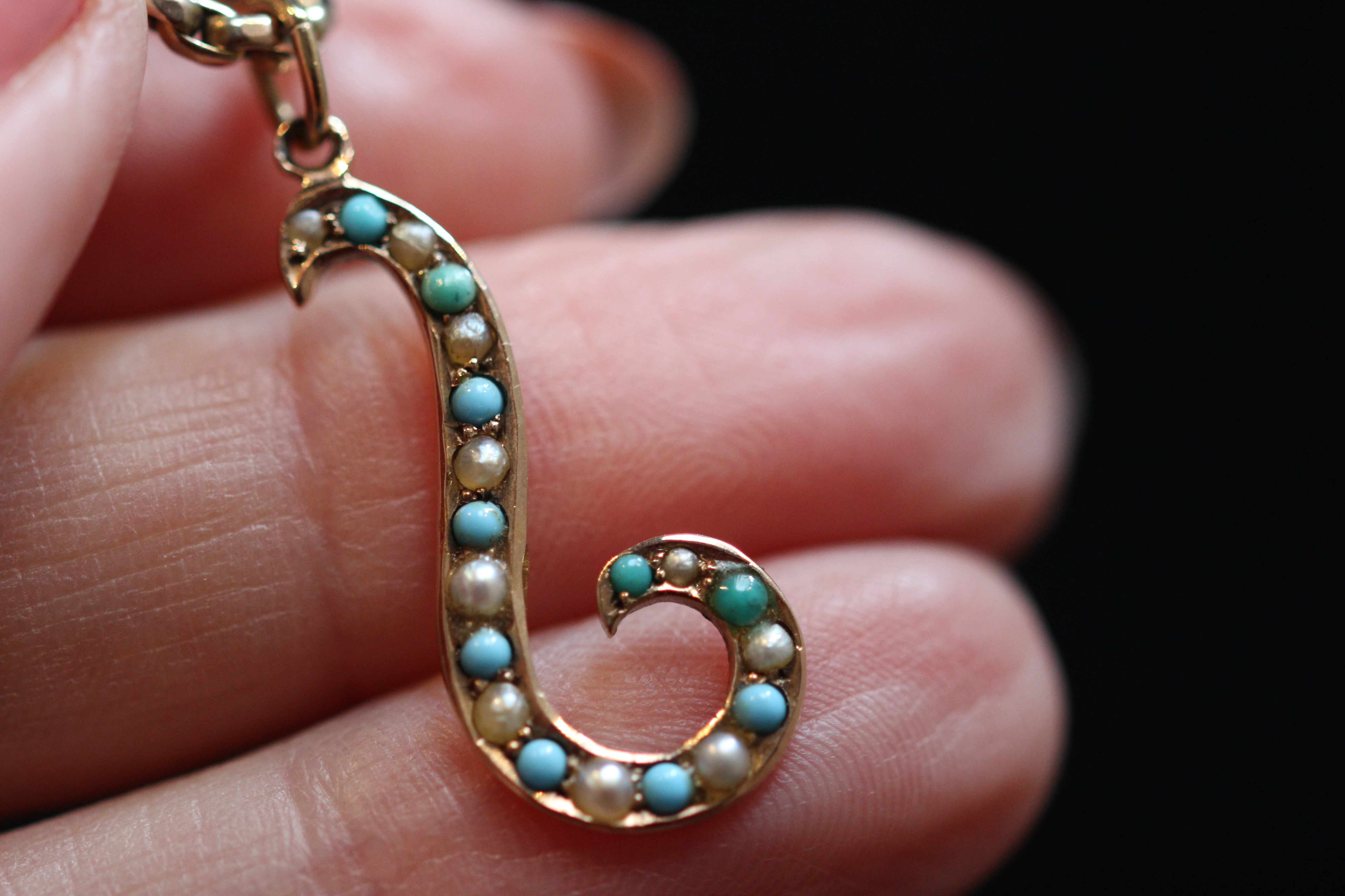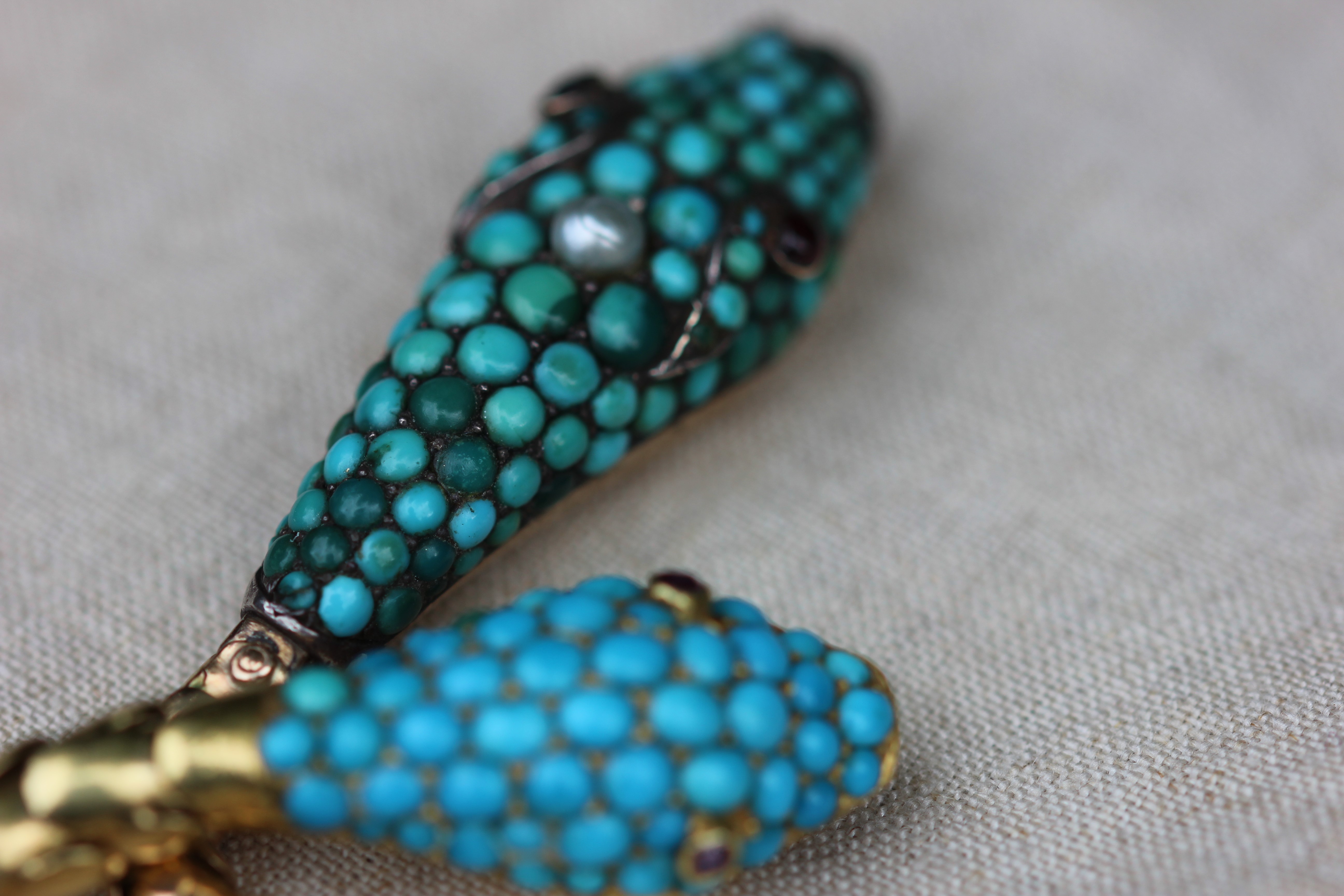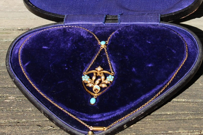 In Georgian and Victorian times, turquoise was used a lot in sentimental jewellery containing flowers as the colour was similar to the blue forget-me-not flower. The pendant in the photo at the top of the post is a good example of such jewellery. There are some lovely Victorian brooches in the shape of a bow or knot that contain turquoise beads. Generally, antique English and European turquoise jewellery will be set in gold and is often pavé set, that is, small beads or stones set closely together, as in the photo above.