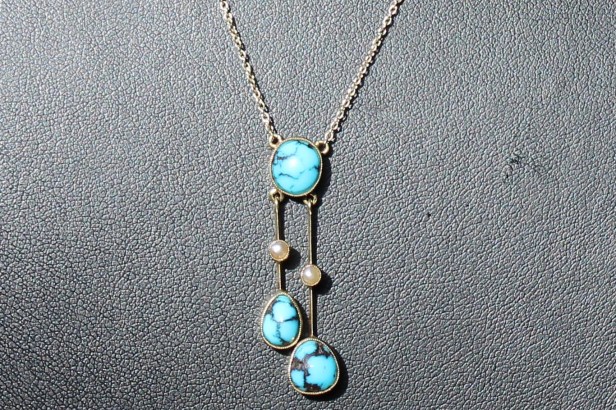 Turquoise is described as a blue stone but its colour can vary a lot, from sky blue to a greenish blue, depending on two factors. The first is where it was mined. Typtically found in arid regions, turquoise is formed when acidic watery solutions seep into rocks and fill crevices. It is often interwoven within a matrix of the host rock. This matrix can be hard to spot, like a spider web in some instances or it can be a striking feature of the stone. Persian turquoise is a sky blue, usually a uniform colour, without markings. Some turquoise from the Americas can have be a greenish colour as it contains iron. Turquoise from Bisbee, Arizona contains dark veining or spider webbing matrix. The turquoise in the pendant below is likely to be from Bisbee.