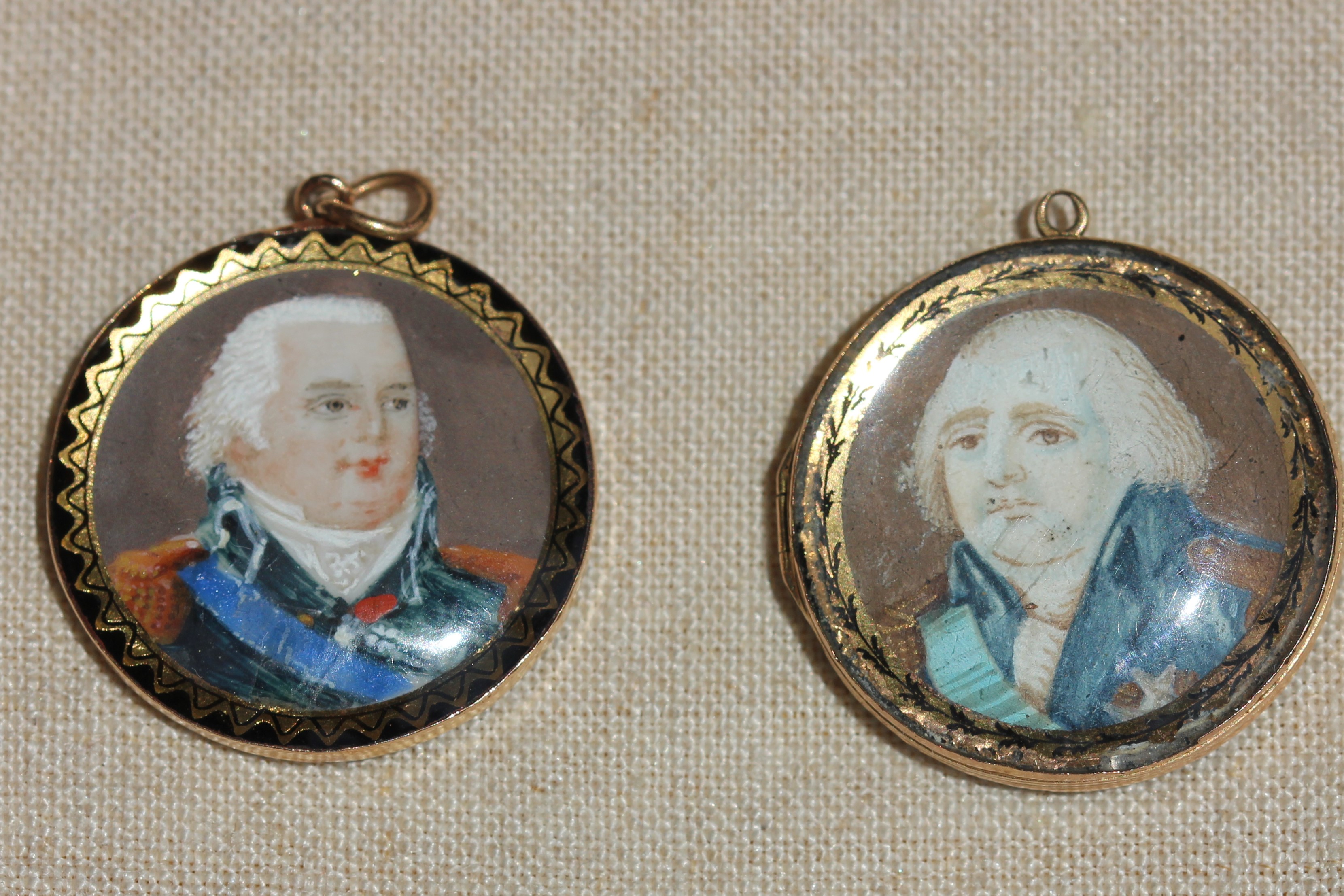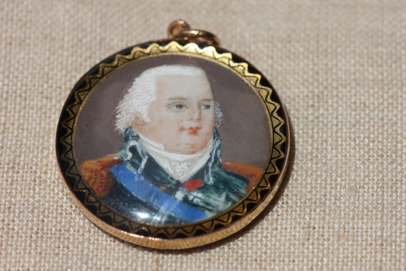 The next painted miniatures are different in that they are paintings of Louis XVIII of France but at different stages of his reign. Louis XVIII was King of France from 1814 to 1824, except for a 100 day period during Napoleon’s escape from Elba in 1815. He was the brother of Louis XVI who, with his wife Marie Antoinette, was guillotined in 1793. When his nephew, Louis XVII, died in prison in 1795, he proclaimed himself king. He was to spend twenty-three years in exile throughout the French Revolution and the First French Empire before being returned to the French throne in 1814.
