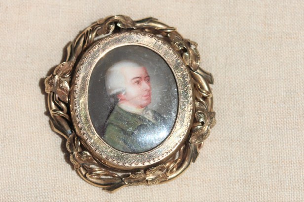 My first painted miniature, of an 18th century male, is set in a rose gold brooch frame with ivy leaves around the rim. The painting is enamelled. The gentleman, who has brown eyes, is wearing a wig, tied with a black ribbon at the back. He is wearing a green coat with black buttons, a white shirt and a white stock around his neck. The back of the brooch has a glazed compartment which might once have held some hair or other memento but it is now empty.