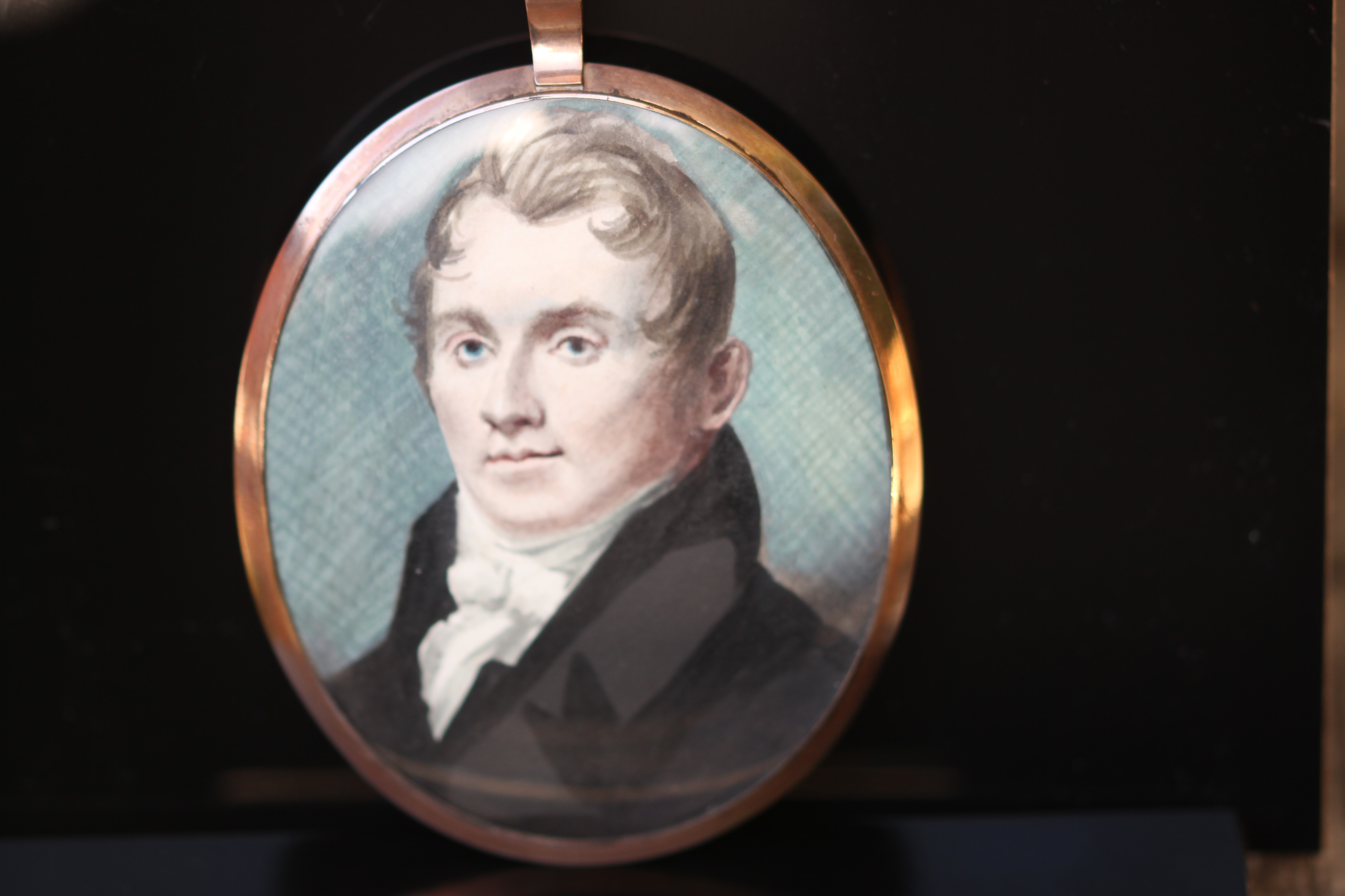 My next miniature, from the late Georgian period, is of this very handsome man. He has blue eyes and his hair has been cut short and beautifully arranged in little curls around his face, although I think it is beginning to thin a little. He is wearing a black wool jacket with a high collar and what could be a satin lapel, and a white shirt and cravat.