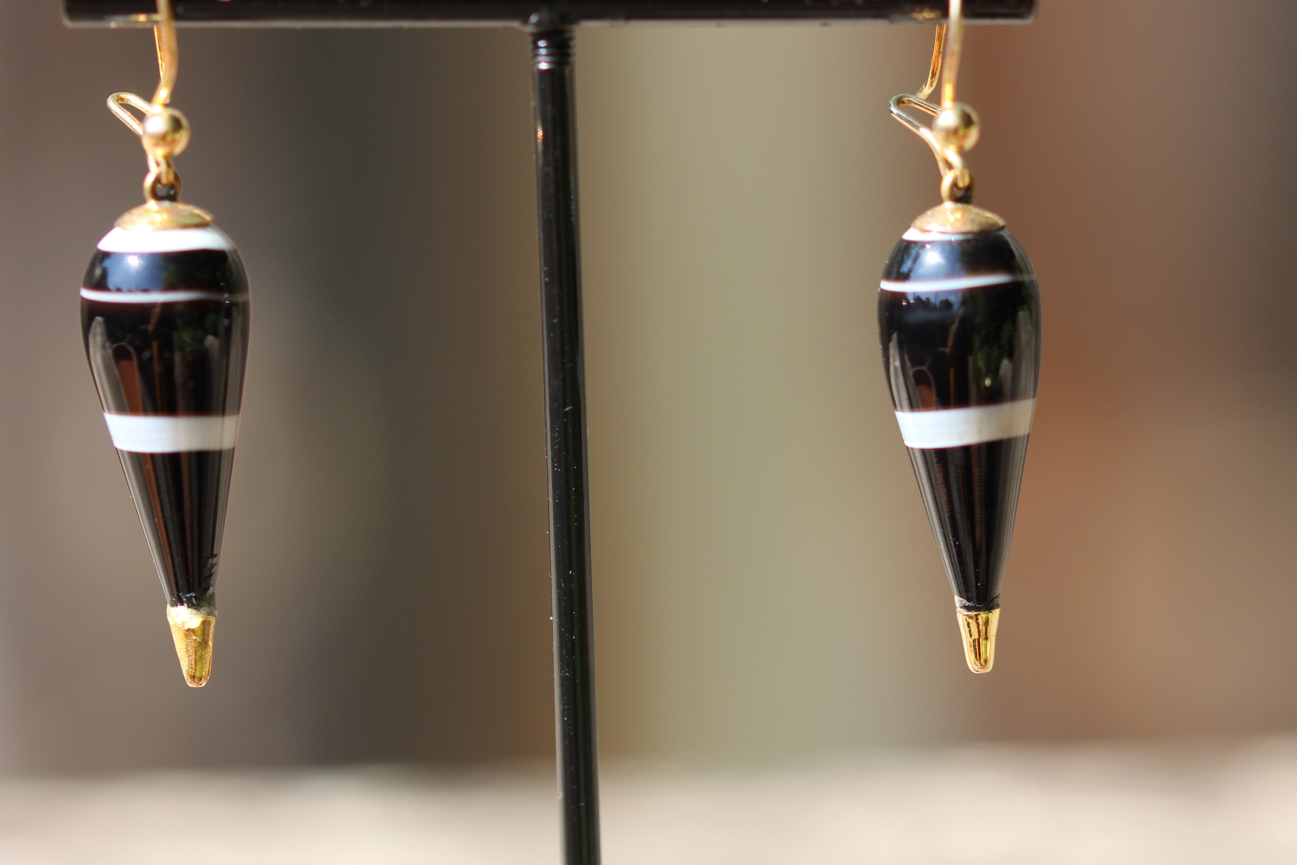 Some other black and white jewellery that I have is made of onyx. Onyx is not just black but is layered with white and so has been used to produce cameos as above, where the faces of Roman men has been carved out of the white layer leaving the black layer beneath. Onyx, with its white and black bands, has also been used for beads for use in necklaces and for creating the beautiful Victorian banded agate earrings in the photo below.