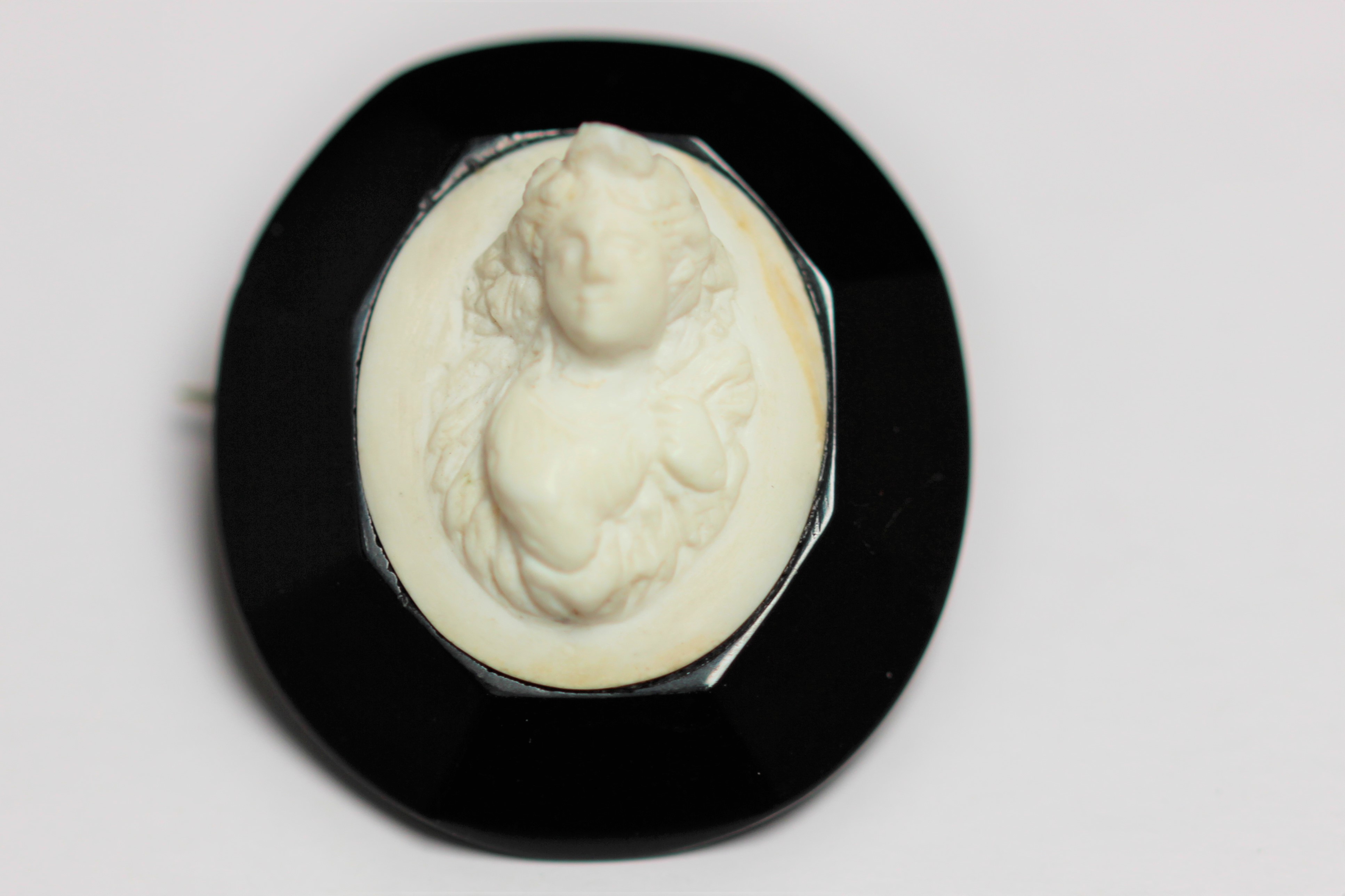 Victorian Whitby jet brooch with carved lava cameo (in Navettejewellery on Etsy)