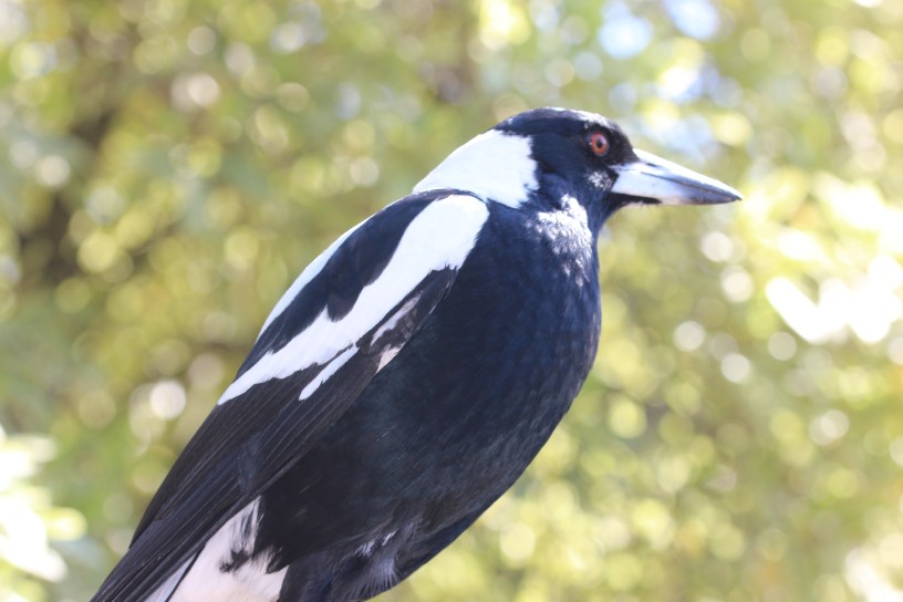 I am visited by a family of magpies most days of the week. In Australia, magpies are large black and white birds with a beautiful song called carolling. They occupy all parts of Australia with only slight variations in their black and white markings. Every year, the magpie parents bring their chicks, usually one but sometimes two, to visit and to use our bird bath until they have grown up enough to forage for themselves and must leave the parent’s territory. Only once has a female chick being allowed to stay on to help rear the next year’s baby.