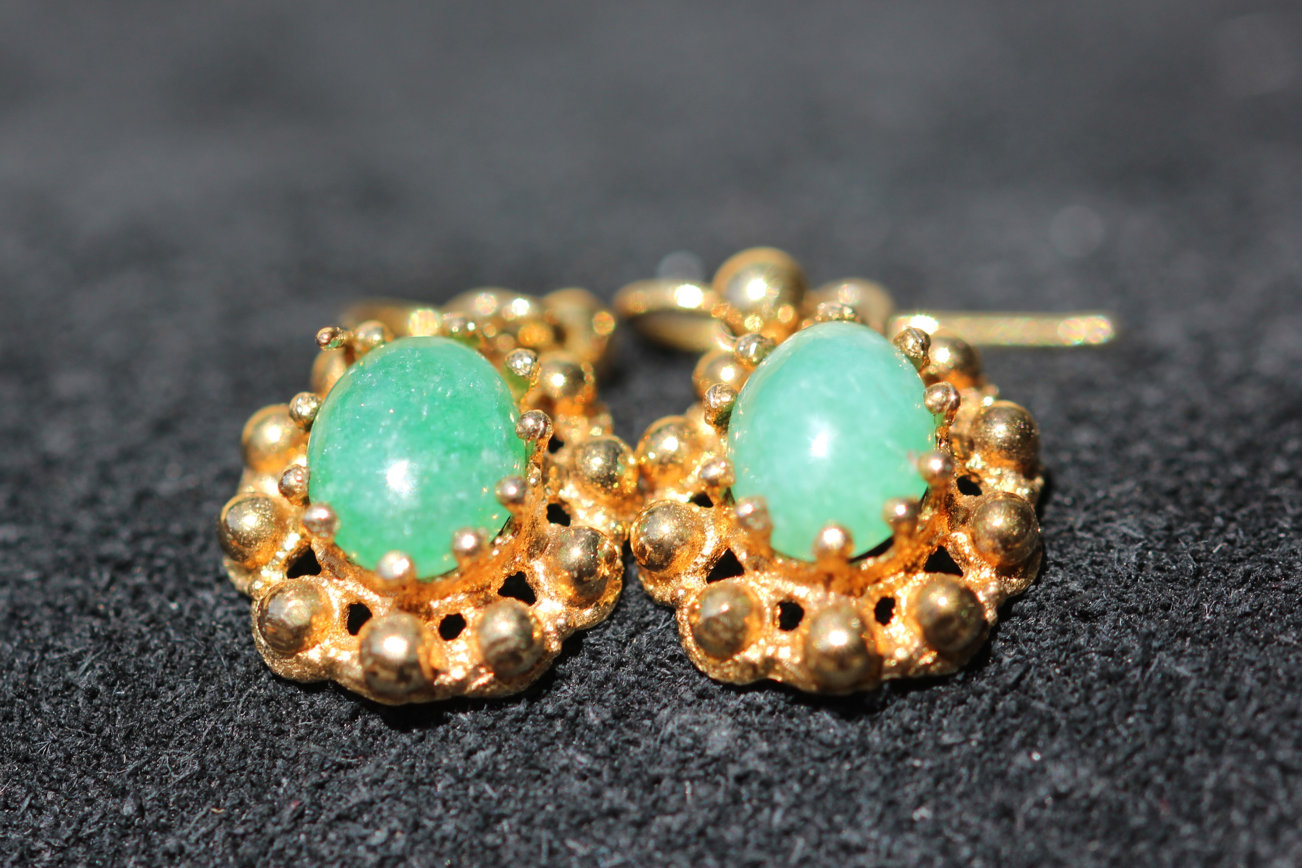 Another feldspar with iridescence is aventurine feldspar which is also called a sunstone. Aventurescence is a spangled metallic sheen caused by lots of tiny mineral inclusions. It can also be found in aventurine quartz as seen in the earrings below.