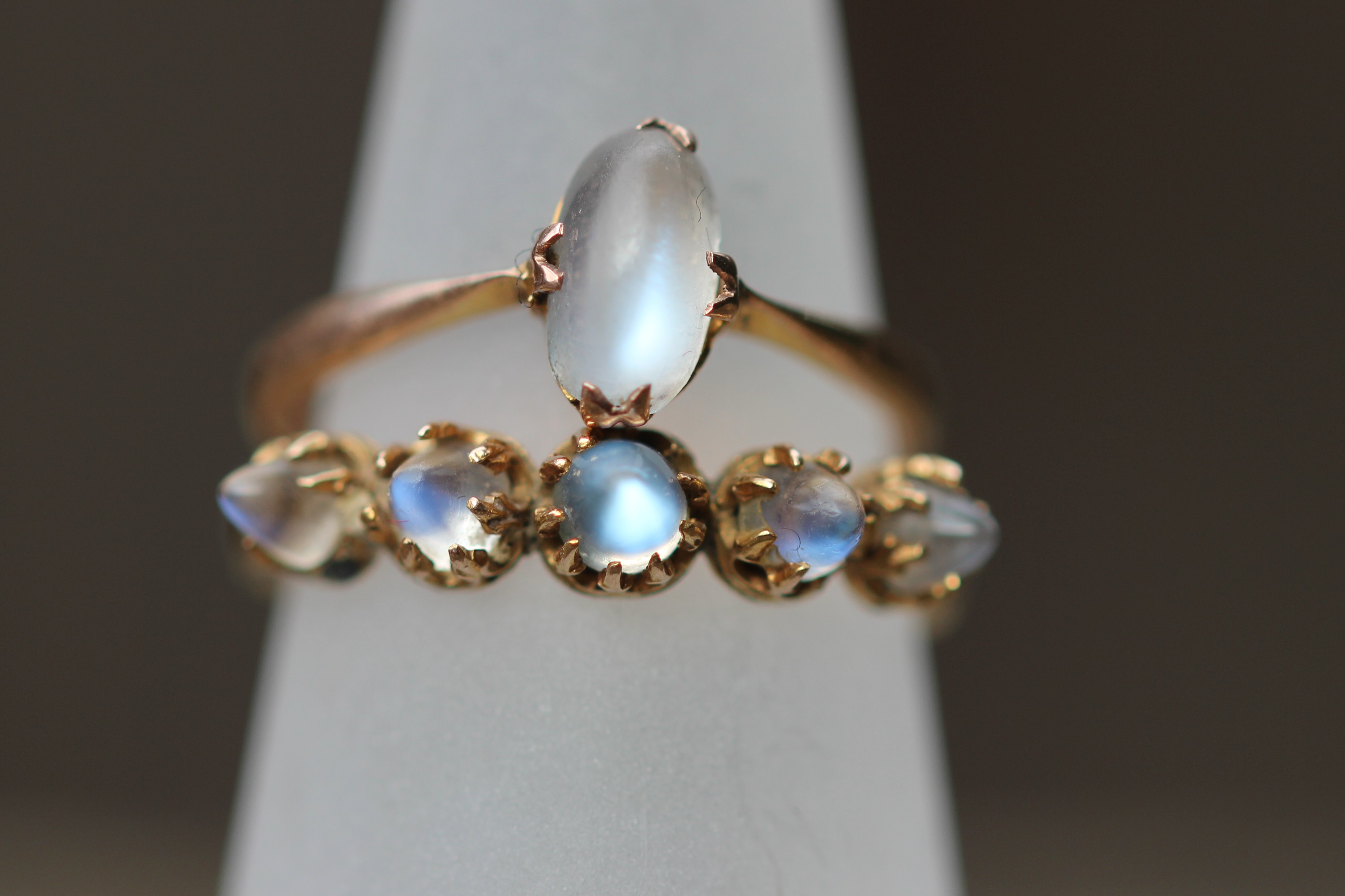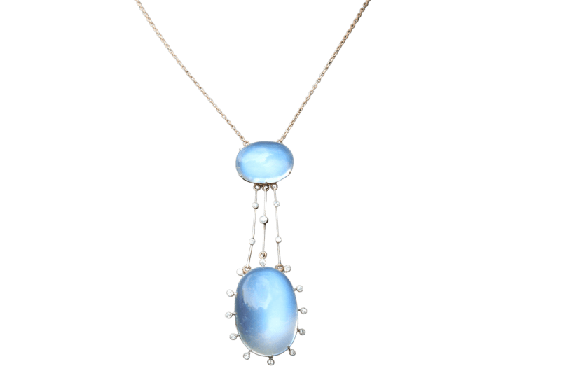 One of the largest groups of gemstones are the feldspars, making up 60% of the earth’s crust. There are a number of gem quality varieties in the feldspar family and many of these varieties display an attractive iridescence sheen, that is, lovely play of colour showing when the stone is turned, due to refraction or internal structures. Moonstone is the best known variety of feldspar to show iridescence. When cut as a cabochon, moonstones, which are usually almost colourless, translucent to transparent stones, have an adularescent sheen which can be a blue or white. Historically, they are linked to worship of the moon as they were seen as reflecting the moon.