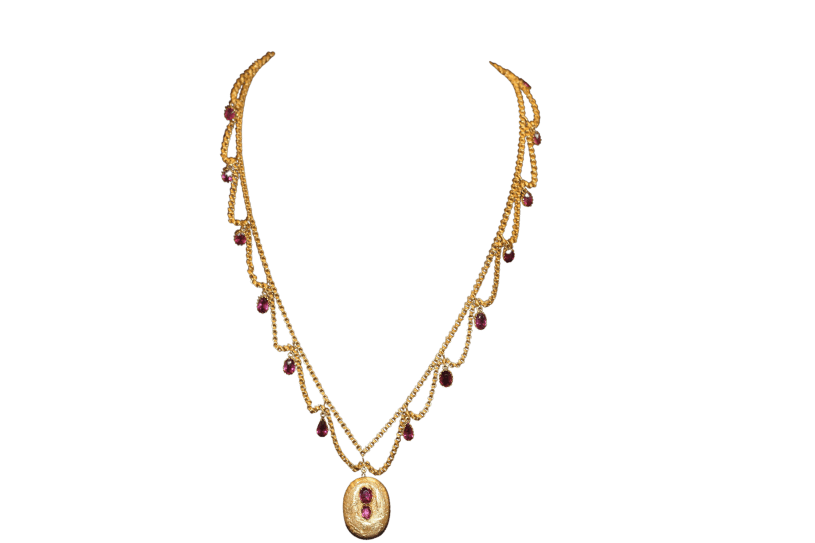 Daniela Mascetti and Amanda Triossi, in their book, ‘The Necklace’, talk about Festonné design necklaces as being ones that incorporates festoons (p217). They point to necklaces from the Classical Greek period with intricate festoons of gold chains in different tiers (pp 13 and 24) and, like Bury, to 18th century necklaces. They discuss the esclavage necklace which ‘consisted of a basic open-work band embellished with single or multiple central festoons, often enriched with pendants ‘ (p61). Esclavage means ‘slavery’ in French. The style originated as peasant jewellery in parts of France. Henri Vever, the famous French Art Nouveau jeweller, described them as a ‘necklace mounted in slavery’, meaning that the chains were entwined and enslaved by each other (M C W Fieggen, ‘Traditional French Jewellery’, 2021). The elaborate ecalavage necklaces in the middle of the 18th century were to become less ornate by the end of the century as noted by Bury, but more opulent versions made of chains of gemstones were to be worn during Napoleon’s reign. Interestingly, Ginny R Dawes with Olivia Collings in ‘Georgian Jewellery’ don’t refer to festoon necklaces at all, describing them as swag necklaces.