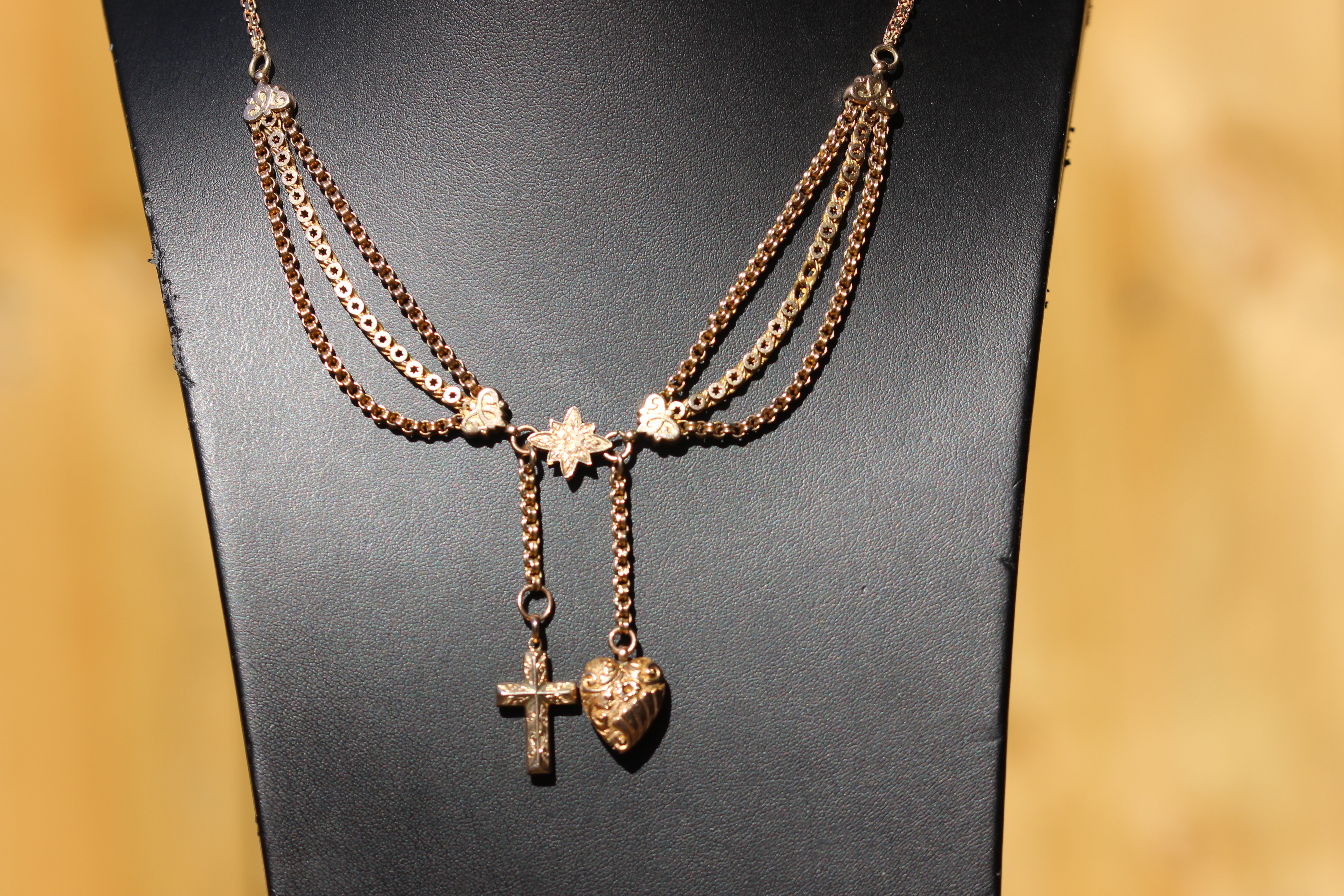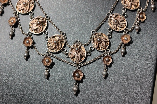 I thought I should start this post by defining what a festoon necklace is as it is not always clear. The word ‘festoon’ is defined in the Chambers Dictionary as ‘a garland suspended between two points; an ornament like a garland’ from the French feston, which is apparently connected to the Latin festum, meaning a festival. That means that we need to know what a garland is. It is defined as ‘a wreath of flowers or leaves; …a crown; ornament’ from the French garlande. So have these definitions clarified anything? Actually, I am still a little unclear about what a festoon necklace is.