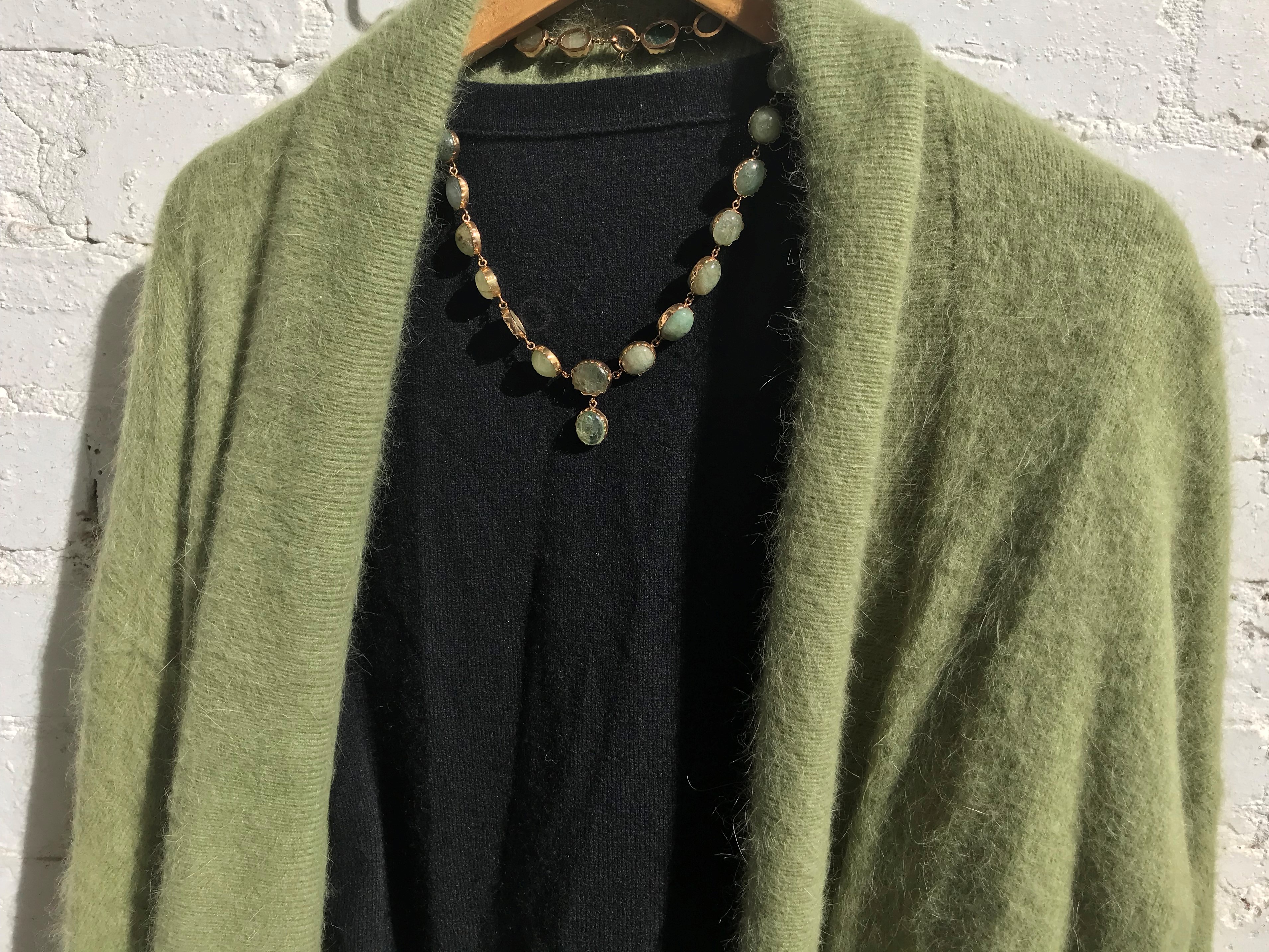 Necklaces also vary in length as more clothes are worn. I find I will either wear a short chain that sits around the neck above the jumper neckline, or a longer chain and pendant /necklace. The longer pieces have to be quite noticeable, otherwise they can get lost in the bulky knits and jackets. The Georgian style beryl and gold necklace below is a good example of an autumn necklace.
