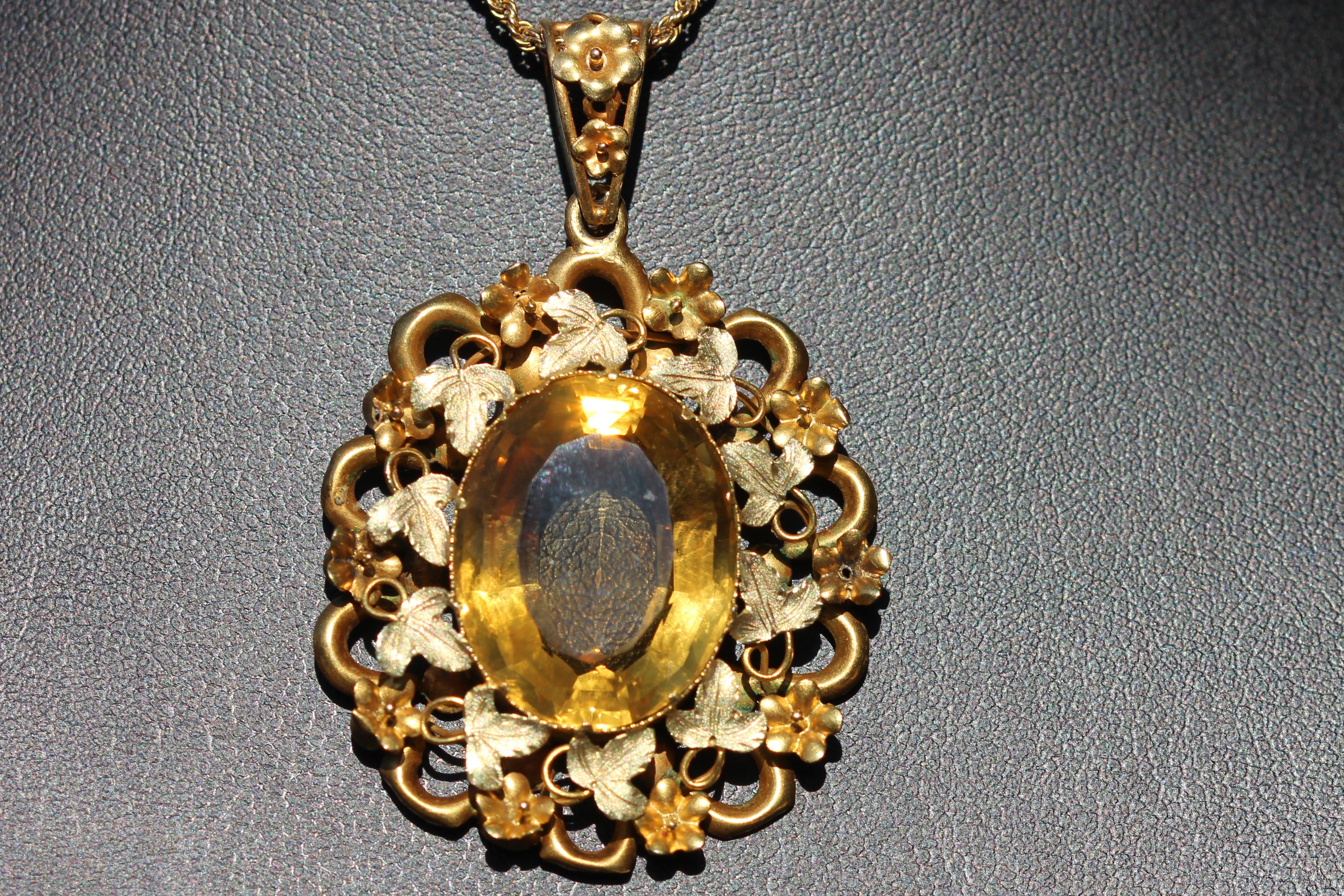 The antique 18ct gold citrine pendant below certainly falls into the noticeable category, measuring 5.40cms (2 1/8 inches) long including the bale and 3.81cms (1 ½ inches) across at the widest part.
