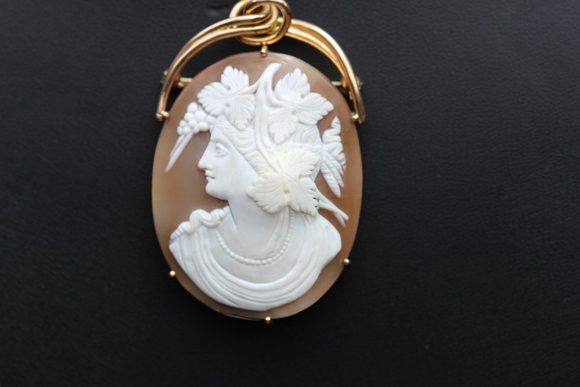 The shell cameo above is probably depicting Flora, the Roman goddess of flowers and the season of spring as she has flowers and leaves entwined in her hair. She has been carved in Queen conch shell, which has cream and pale pink layers – very feminine.