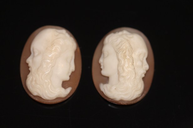 The most unusual portrayal I have in jewellery are the two cameos above. If you look closely, you can see there are three faces depicted on each – one female and two male heads. These are known as grylli cameos. A gryllus is a group of cojoined heads carved as a cameo. The name derives from the Latin meaning caricature. Grylli cameos are usually strange combinations of beasts and humans, often with mythological associations.