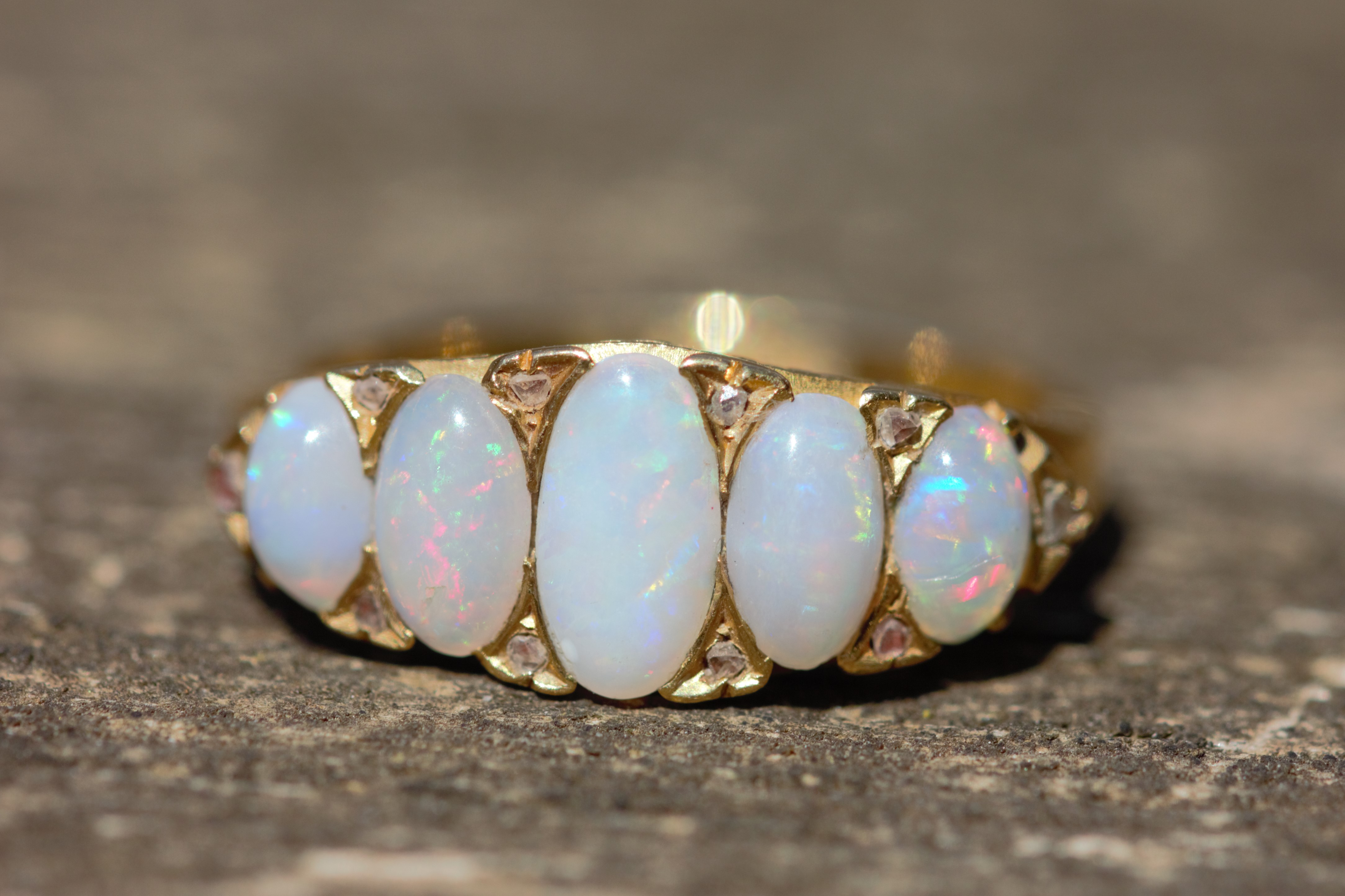 The other piece of jewellery called to mind by mist is this ring, below, set with white opals. White opal, as the name suggests, has a white background with lovely play of colour. Before the discoveries in Australia of black opals at the end of the 19th century, jewellers used either white or crystal opals.