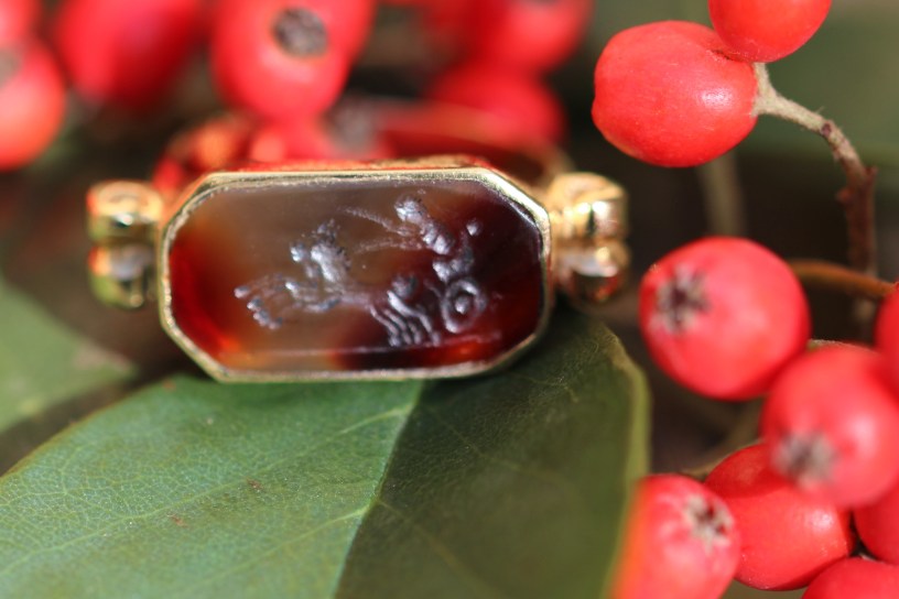 Reds, purples and pinks are winter colours, seen in plants with berries, as well as in camillas, orchids, daphnes, and grevillas. The striking Roman intaglio agate ring in the photo at the top of the post copies the red of the berries beautifully as well as displaying some internal yellow bands, like weak winter sunlight. The intaglio is of a charioteer with whip driving a biga, a two horse chariot.