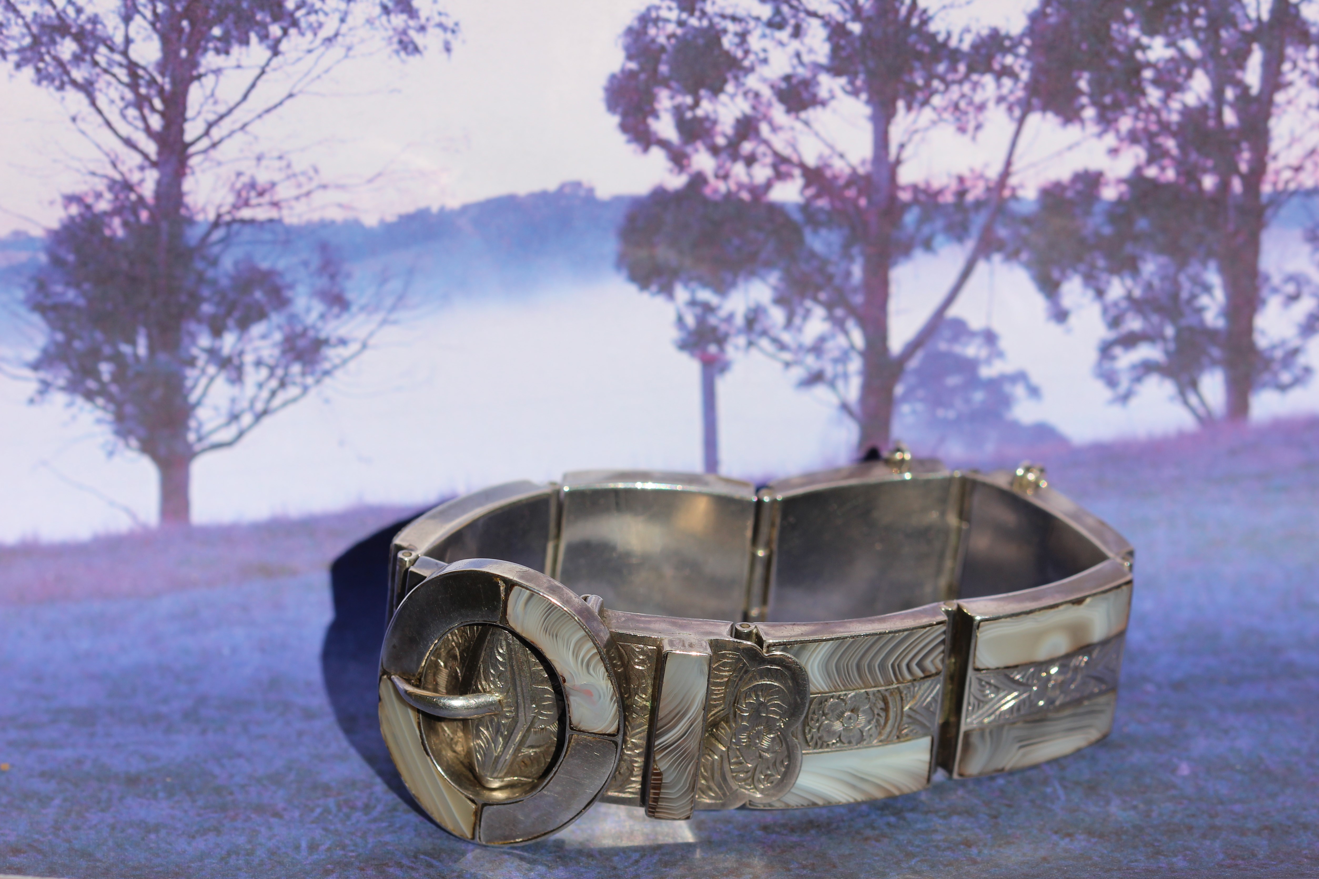 It is the middle of winter in Melbourne and it is mostly overcast, misty, grey and chilly. It is odd to write this when the Northern Hemisphere is experiencing such high temperatures. And winter is not all bad, of course. There are some lovely colours around, even if slightly muted. The mist in particular reminded me of two pieces of antique jewellery. The one below is a Scottish silver and agate bracelet from around the end of the 19th century. The agate is a lovely pale grey with striations, called a Montrose agate.