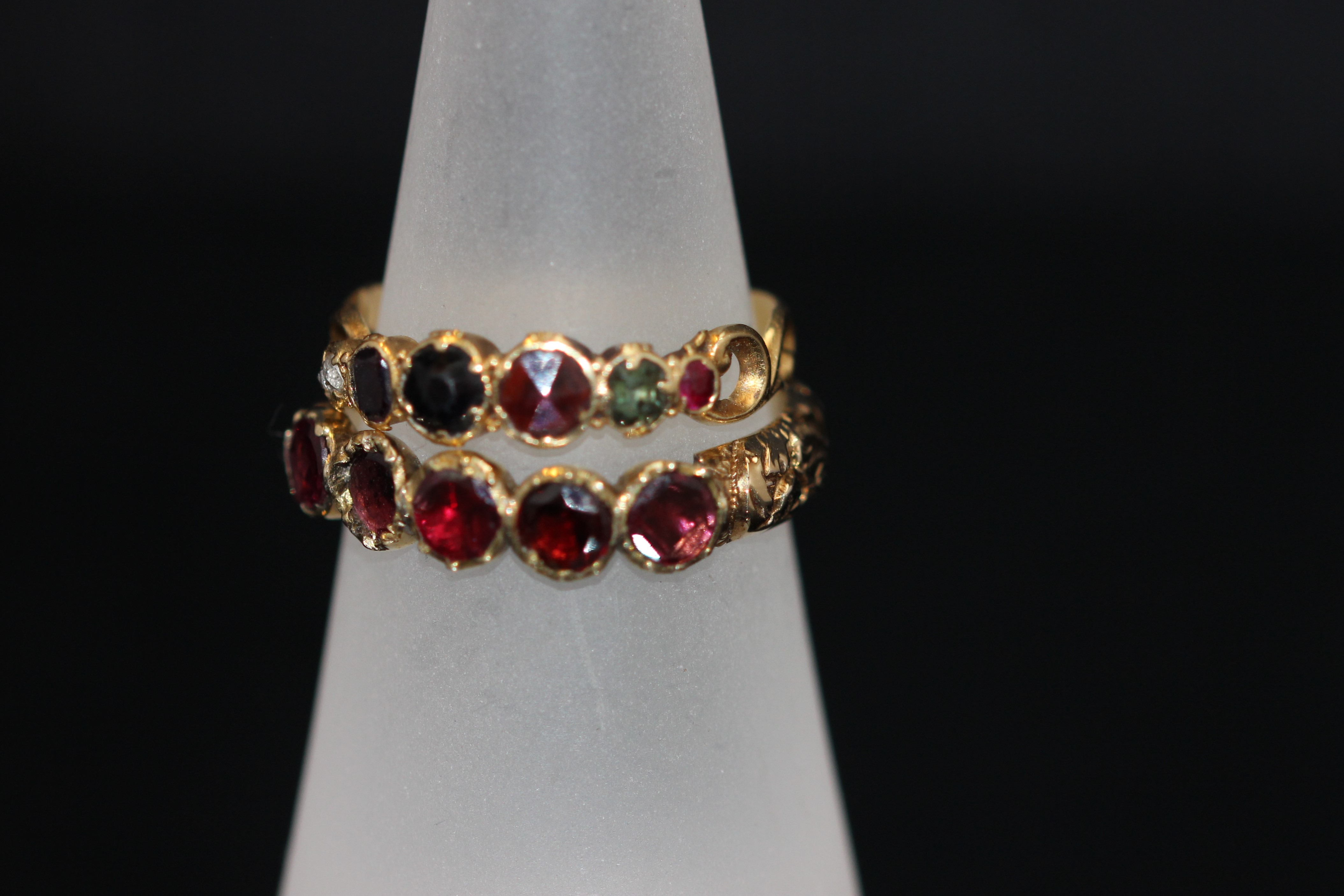 The two early Victorian stacking rings below also match the somber winter reds. Both are foiled, one with five garnets and the other an acrostic ‘regard’ ring.