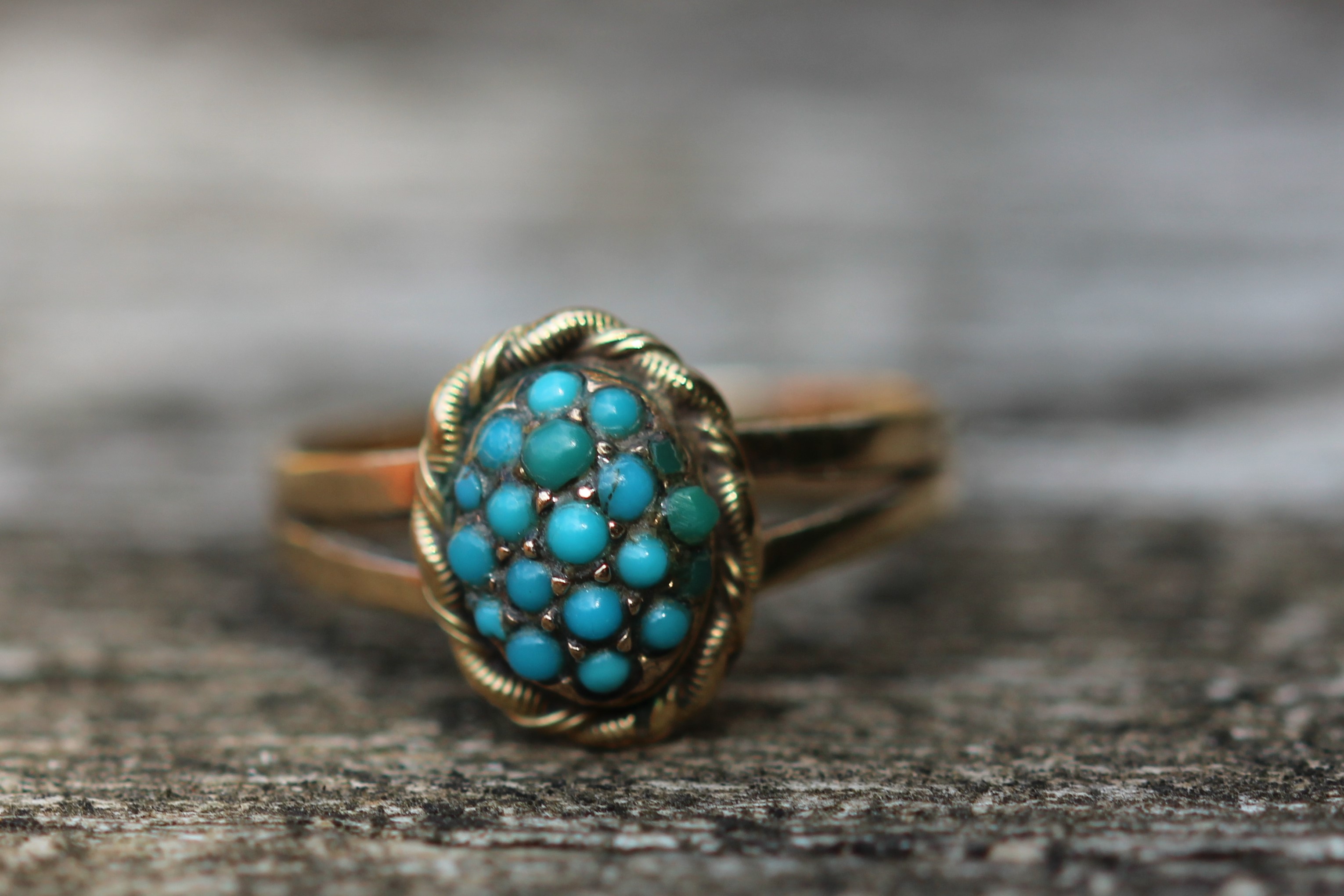 The second piece is an Edwardian ring with a centre pavé set turquoise dome and a gold ribbon border. Some of the turquoise have darkened slightly.