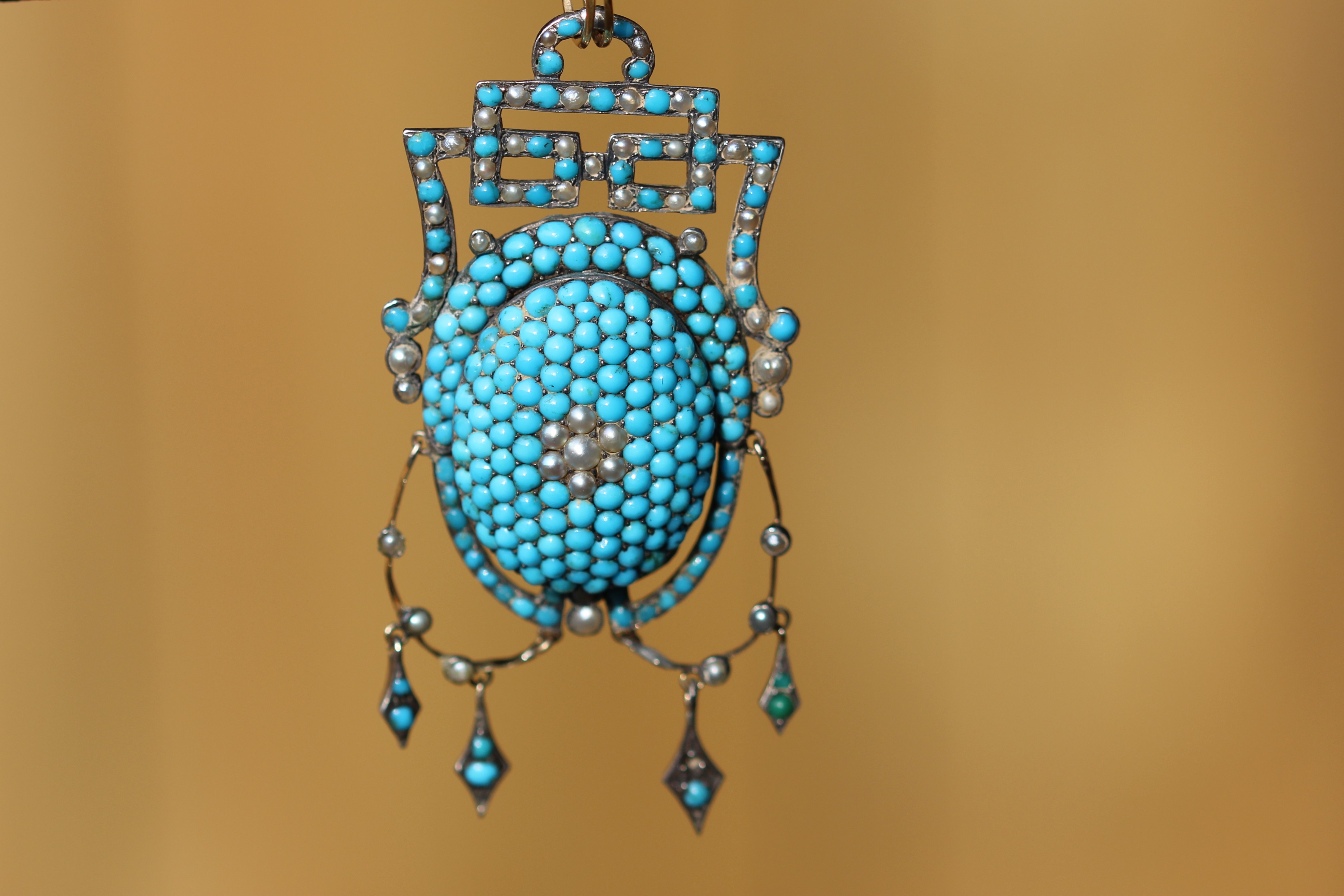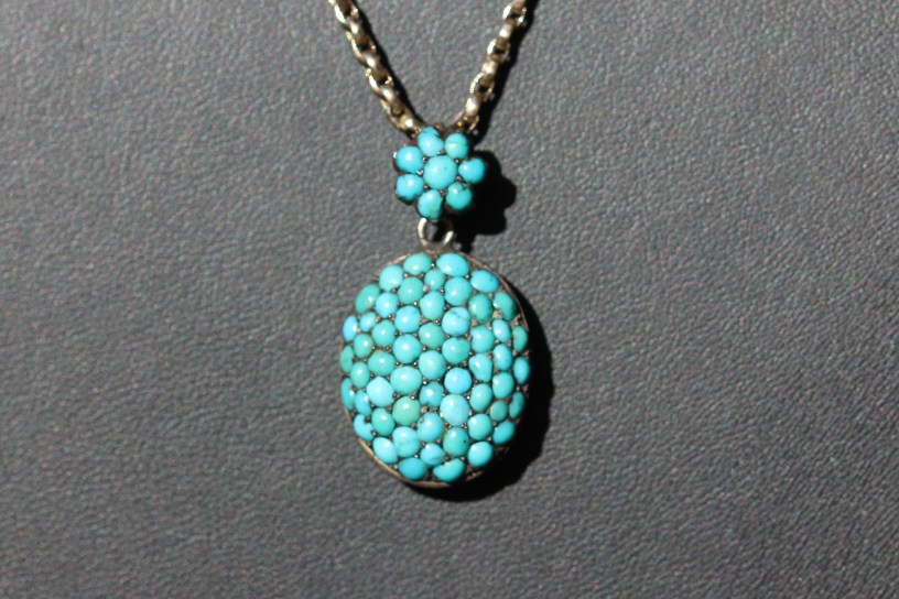 Here are a few pieces that illustrate how attractive turquoise pavé set jewellery can be. The first piece is a stunning large Victorian pendant/locket with a central pavé set dome, surrounded by a turquoise and seed pearl frame. The front is silver and the back was gilded at some stage.
