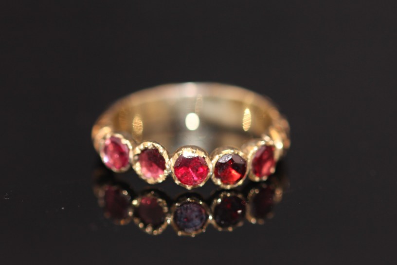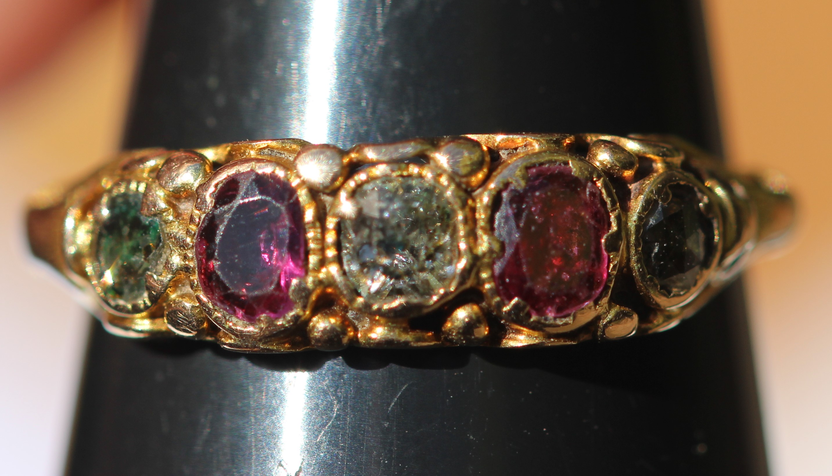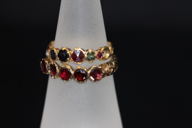 Half hoop rings are usually quite simple in style. Most of those for sale now are from the 18th and 19th centuries. They can be set with the same gem or with a mixture of gems set in collet or cut-down collets, that is, the gold or silver setting is pressed tightly around the gem, forming a little cup. With the cut-down collet, the top of the cup is cut away slightly. The back is closed. Many from the early 19th century are acrostic rings , that is, the initial letter of each stone spelt out a word such as ‘dearest’ or ‘regard’.