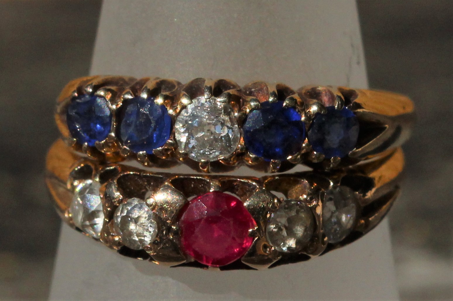 The two rings below are both Victorian. One has a central diamond with two sapphires on each side, while the other has a central ruby with two diamonds on each side. All are in simple claw settings.