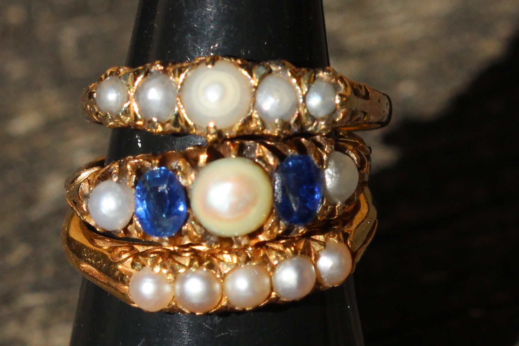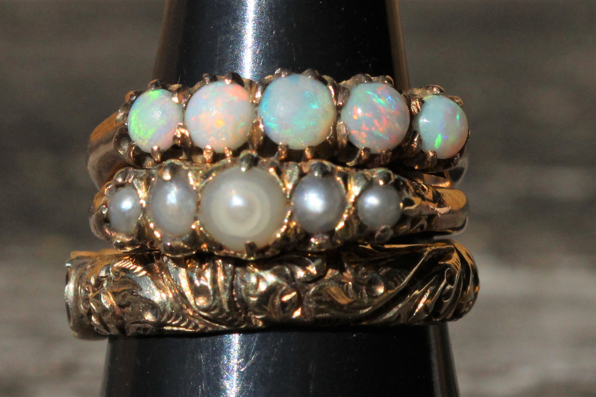 Then below are three antique rings. The top is set with white opals and the middle is a five pearl setting. The bottom is a gold ring with lovely engraving.