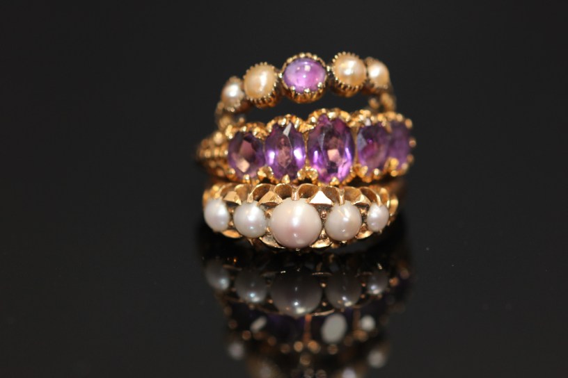 The three rings at the top of the post are one of my favourite combinations. Pearls and amethysts go very well together.