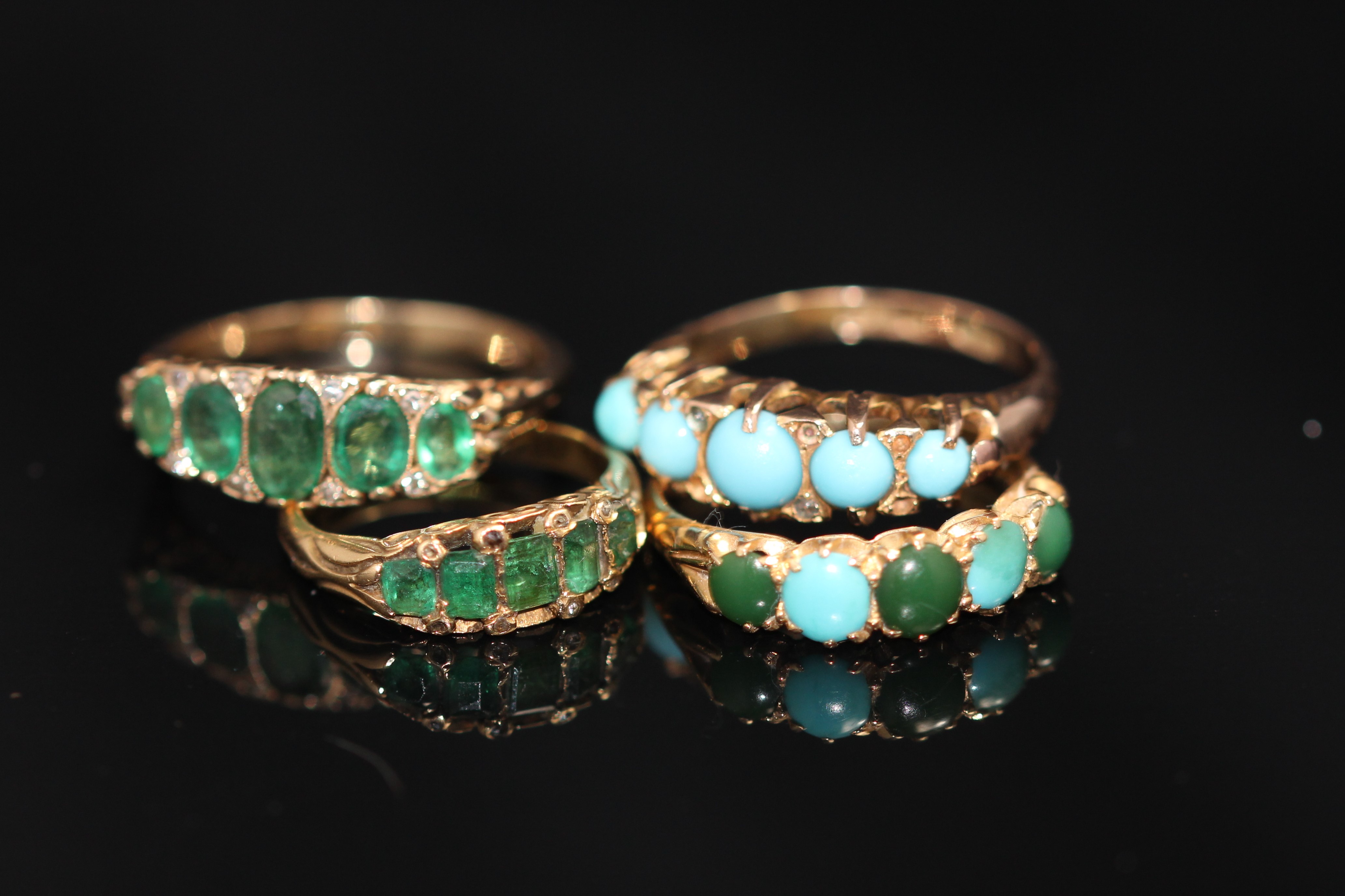 Then, finally, there is a collection of green and turquoise set rings. The green stones on the left rings are emeralds while the green stone in the ring on the right is set with jade. The colours go together surprisingly well.