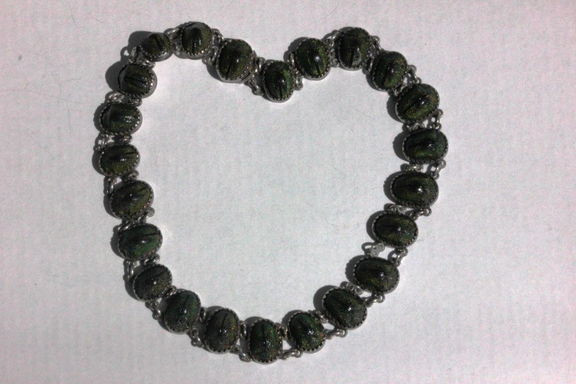 There is a very long history associated with the use of beetles as decorative items, unlikely as it may seem. Eygptologists began to find little stone amulets buried with women and children in cemeteries dating from round 2500BC. These amulets were pyramid shaped and had geometric and animal designs engraved on the bottom. A beetle was one of these animals. Over time, the shape of these amulets changed and flattened, and as well, the beetle, particularly the dung beetle, emerged as the only animal used. The dung beetle, Scarabacus Sacer L, was viewed by the Egyptians as symbolic of the cycle of rebirth and regeneration as represented by the god, Khepri, who was believed to roll the sun across the sky each day, leading to a new day.