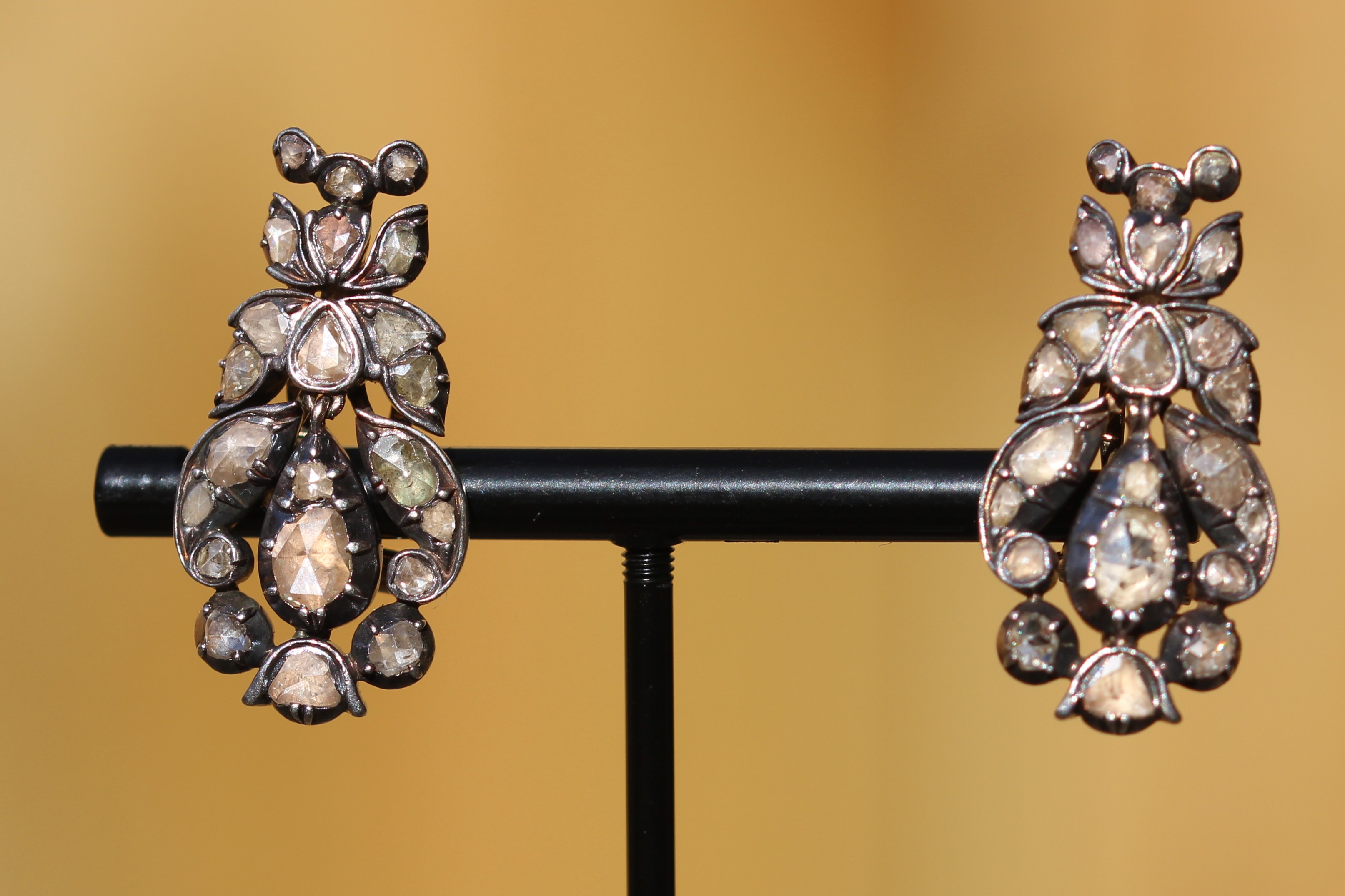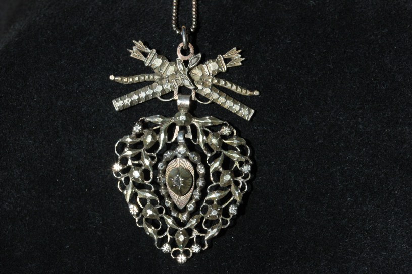 A plentiful supply of diamonds from Brazil, starting from around 1720, meant that ‘jewels progressively transformed into metal structures to hold as many stones as the face-up surface would allow’ (Carvalho, p122). The pendant at the top of the post is a good example of this. Diamonds were usually set in silver, sometimes with gold backs and were close-backed. An old Brilliant cut set in a closed back looked as if the culet was a black dot, an effect that was copied with diamond simulants like paste (Carvalho, p127).