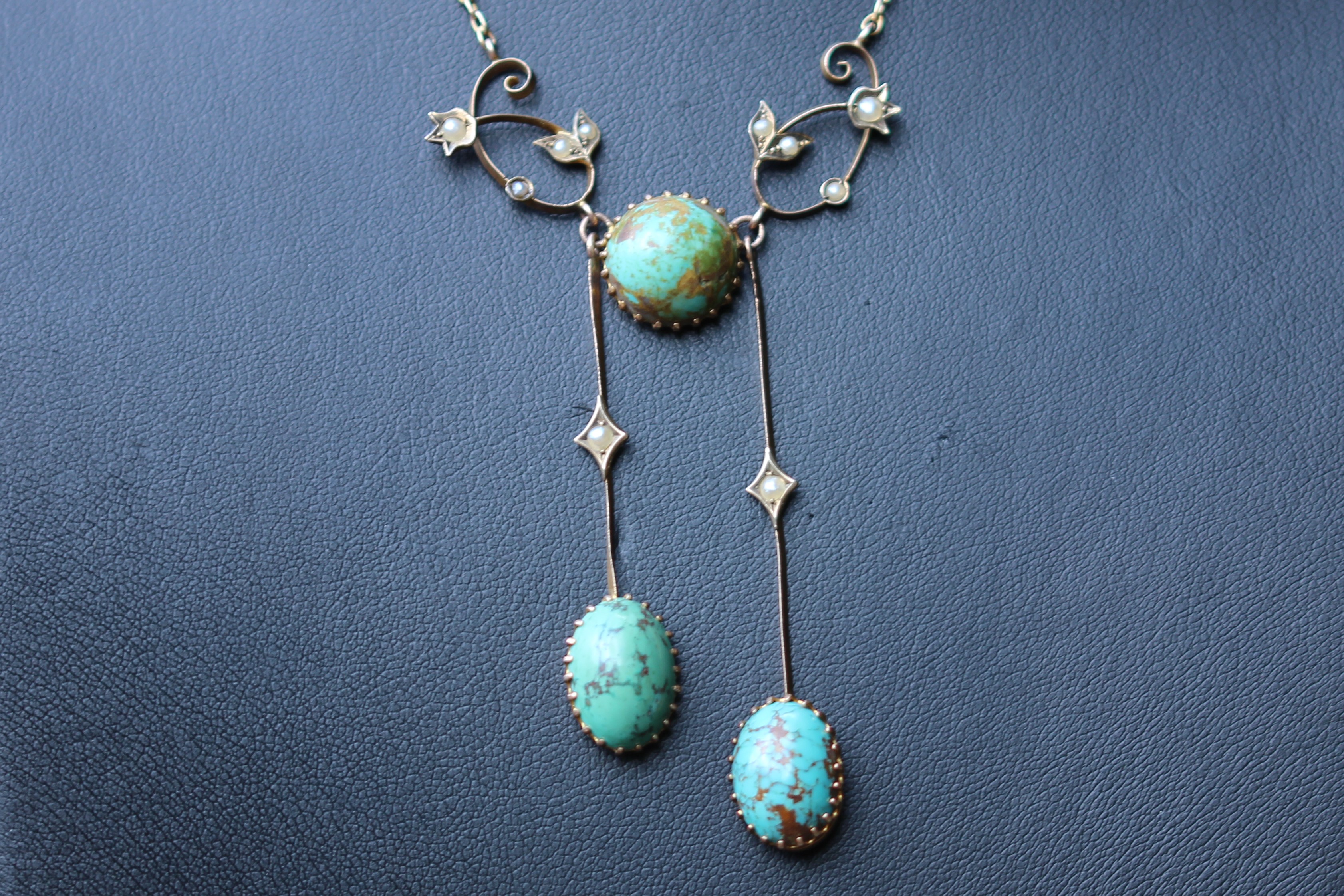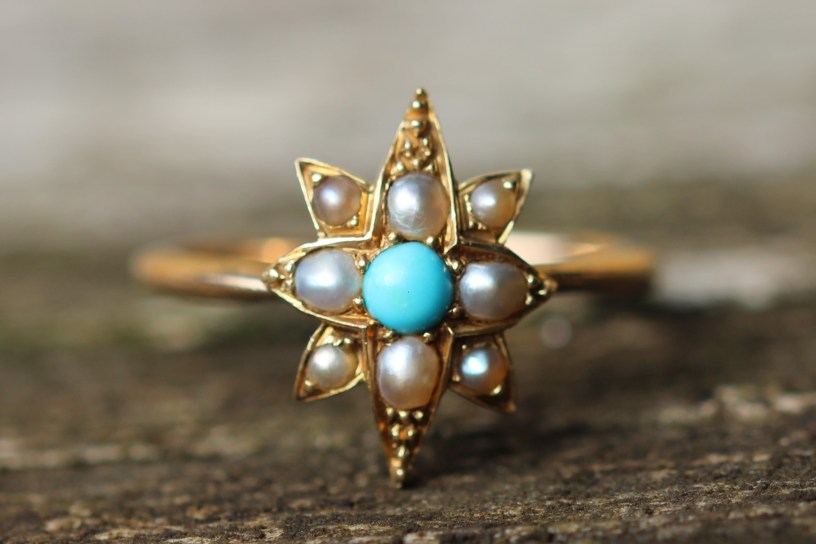 You can see in different pieces of antique jewellery that the colour of turquoise can vary from a sky blue to a greenish blue, depending on two factors. The first factor is where it was mined. Typically found in arid regions, turquoise is formed when acidic watery solutions seep into rocks and fill crevices. It is often interwoven within a matrix of the host rock. This matrix can be hard to spot, like a spider web in some instances or it can be a striking feature of the stone. Persian turquoise is a sky blue, usually a uniform colour, without markings. Some turquoise from the Americas can be a greenish colour as it contains iron. Turquoise from Bisbee, Arizona contains dark veining or spider webbing matrix.