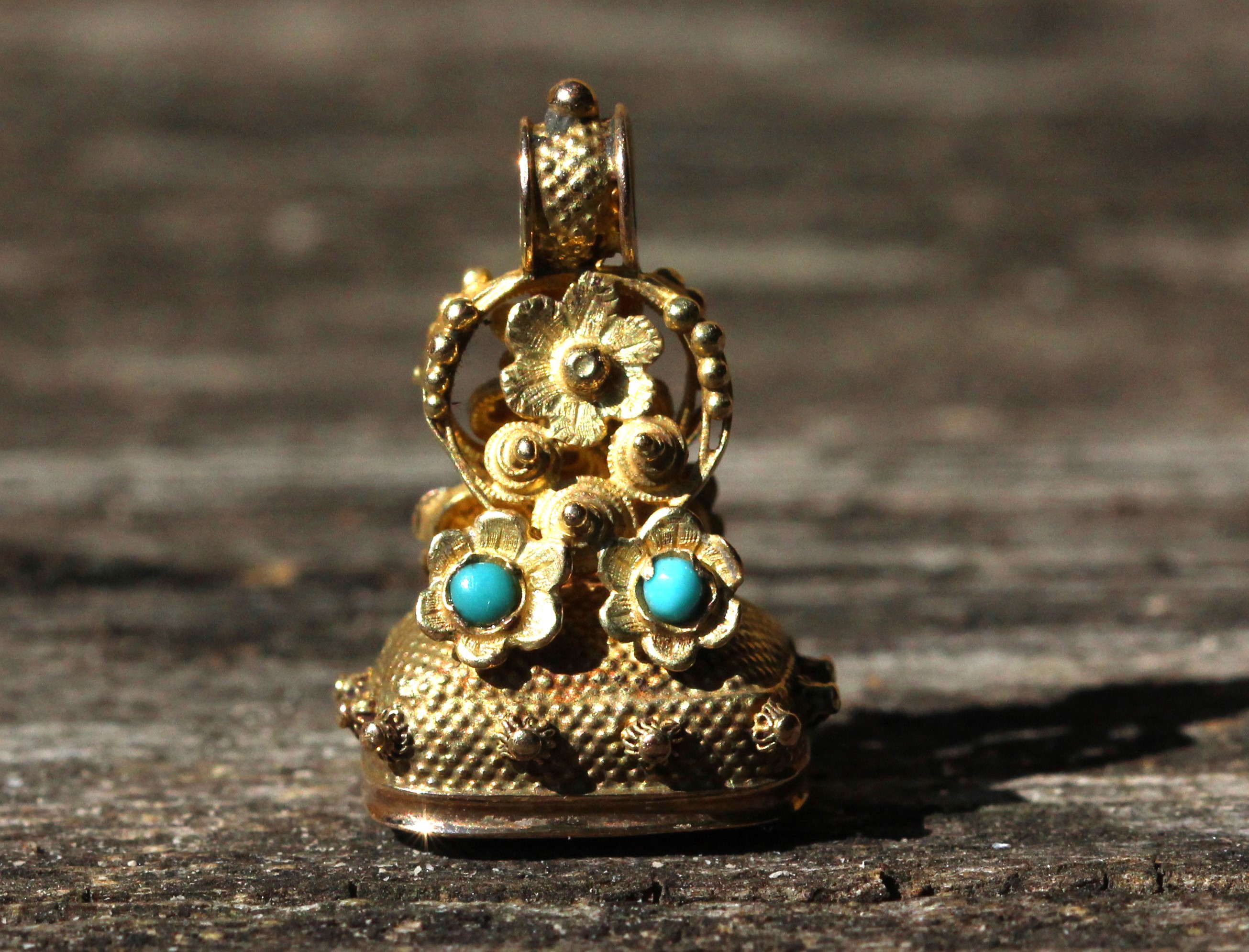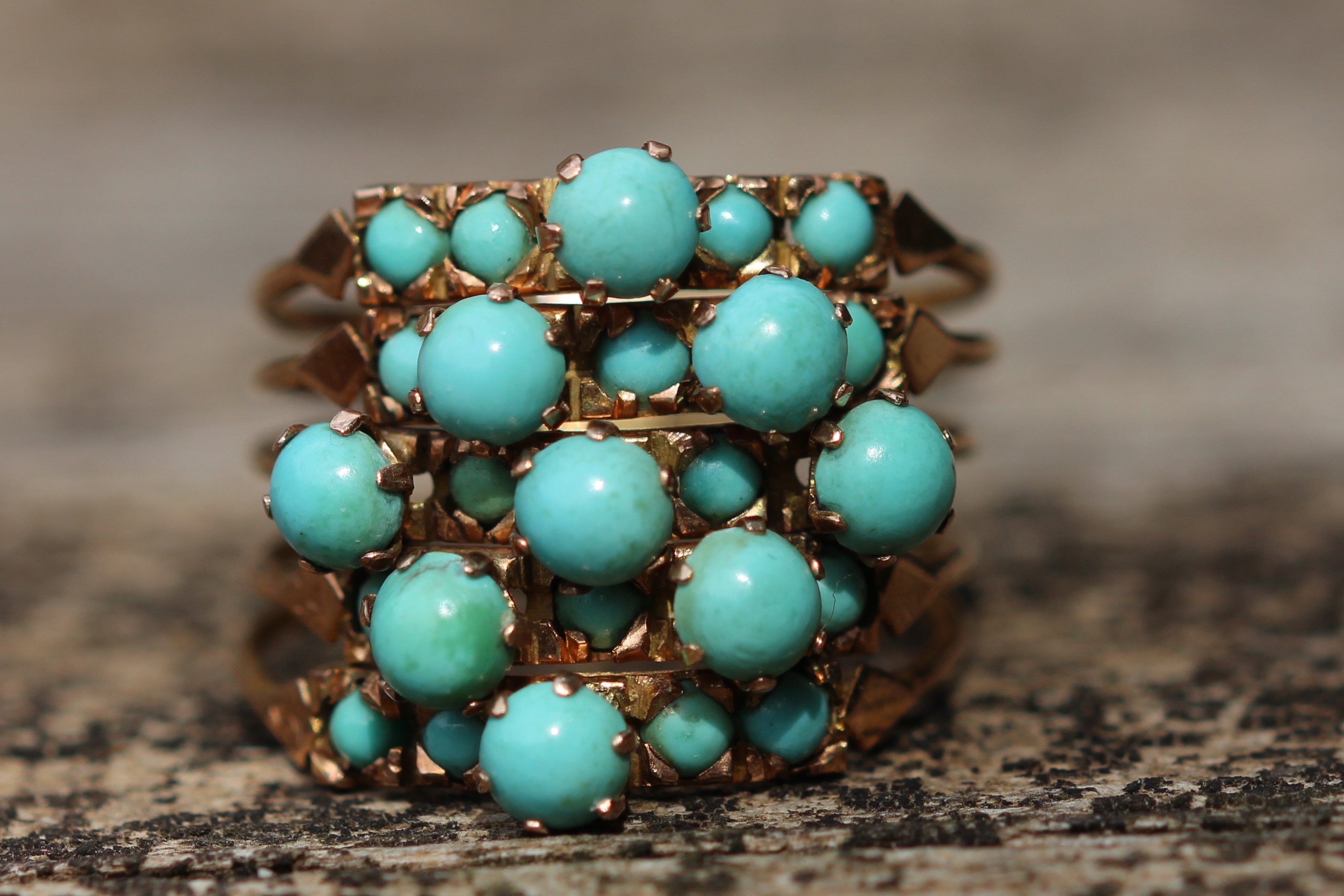 Although popular with the Egyptians and Romans, turquoise was not common in the Europe during the Dark and Middle Ages. It was in the 14th century that it began to be used more frequently, particularly for religious jewellery and ornaments. Turquoise began to be used in non-religious jewellery in the 16th, 17th and 18th centuries. It was used in particular in sentimental flower jewellery as the blue colour was similar to the blue forget-me-not flower. In the 19th century, turquoise was also used a lot in Egyptian revival pieces.